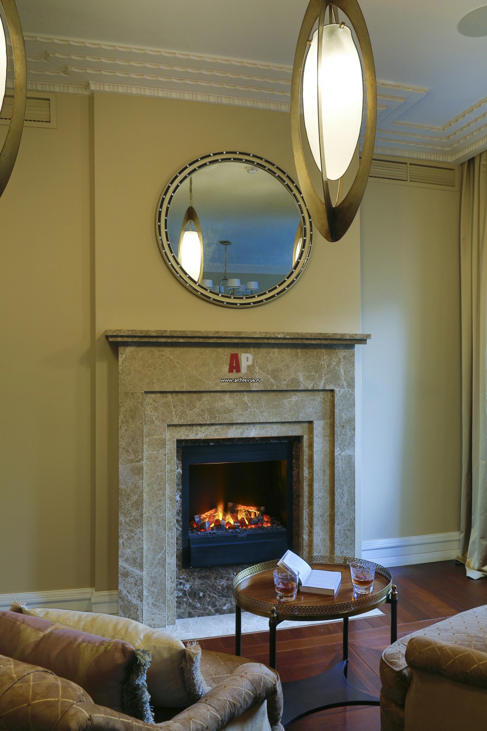 Атмосферу уюта в семейной гостиной создает камин. Топка обрамлена порталом из бежевого мрамора.