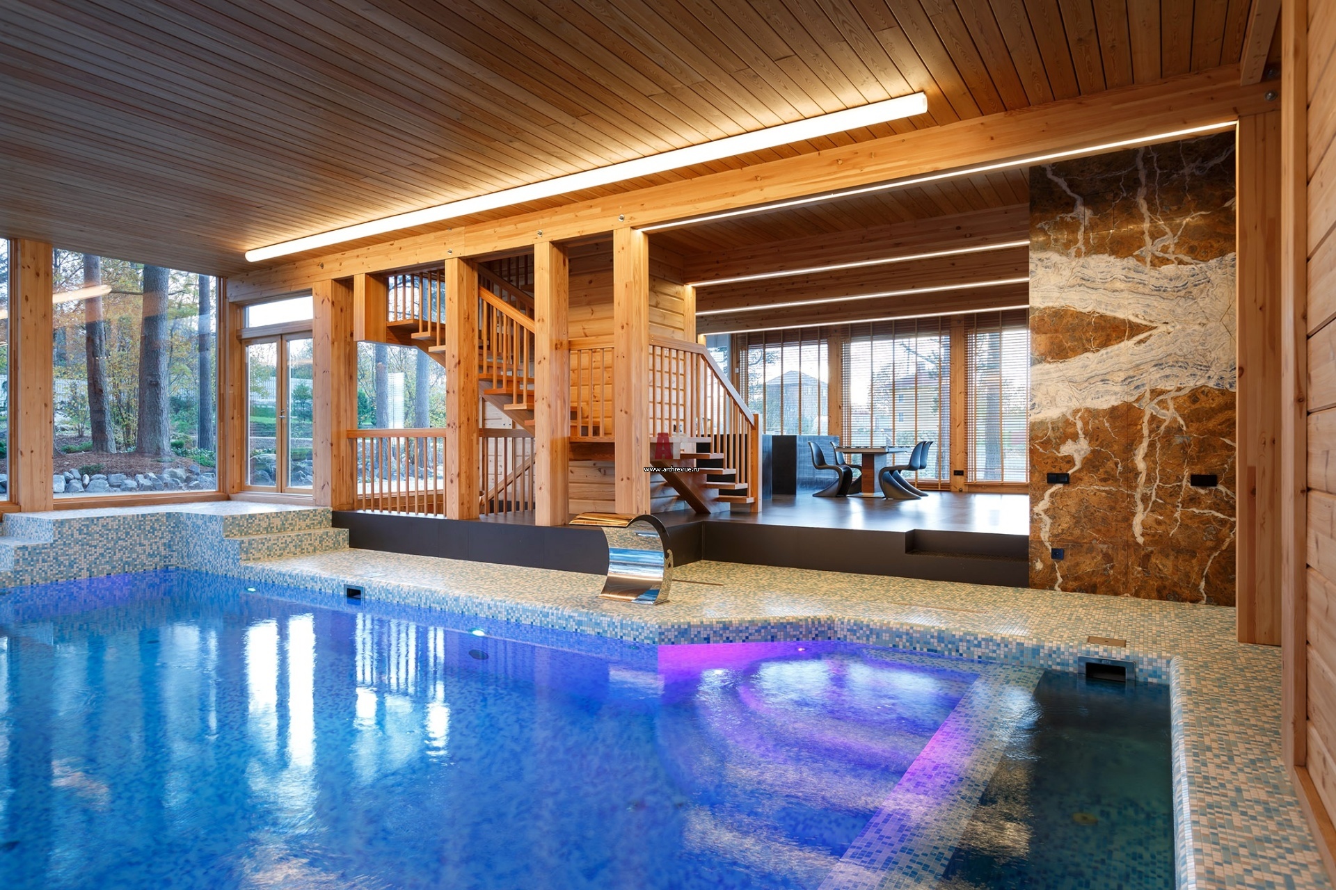 На первом этаже СПА-комплекса находится бассейн с мозаичной чашей. Балки и колонны – элементы несущих конструкций, они не скрыты от глаз а напротив, акцентированы лестничным маршем и подиумом.