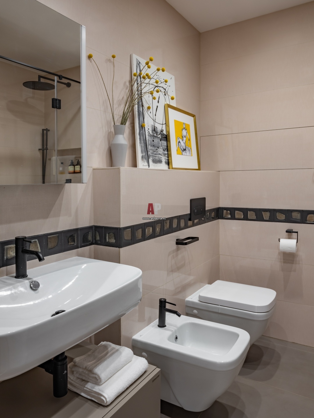 Санузел выполнен в однотонной отделке. Сантехника, Noken. Подвесная тумба, Gamadecor. Керамогранит, FAP Ceramiche. Картины Софьи Пятницкой «О скитаниях вечных и о зиме» и «Мари» Франсуа Саук.