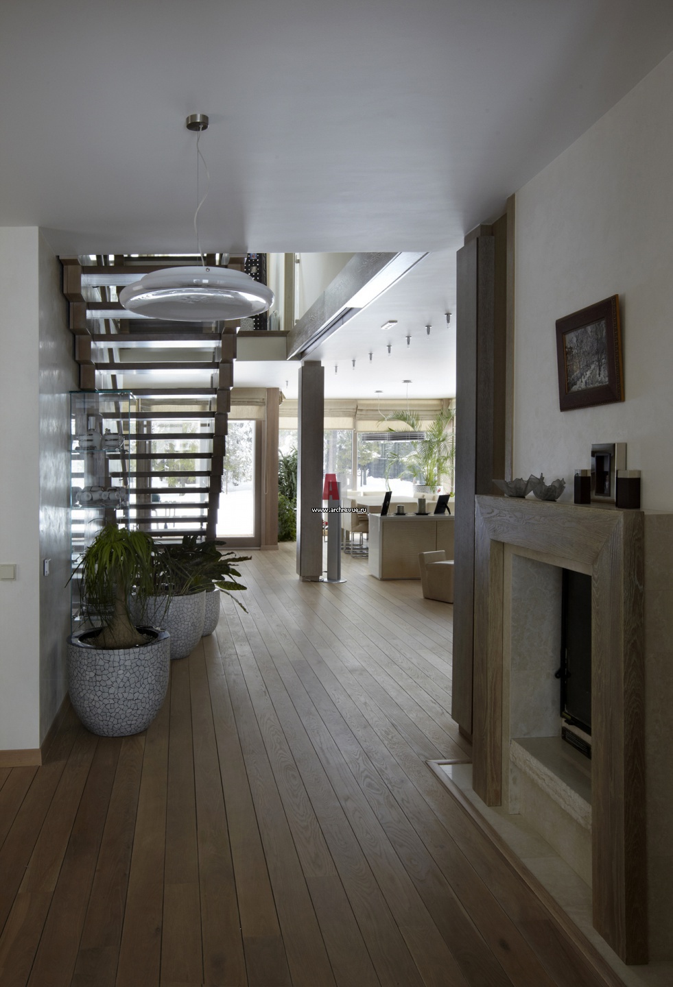 Вид со стороны входа и каминной зоны на гостиную, лестничный холл и панорамное остекление террасы.