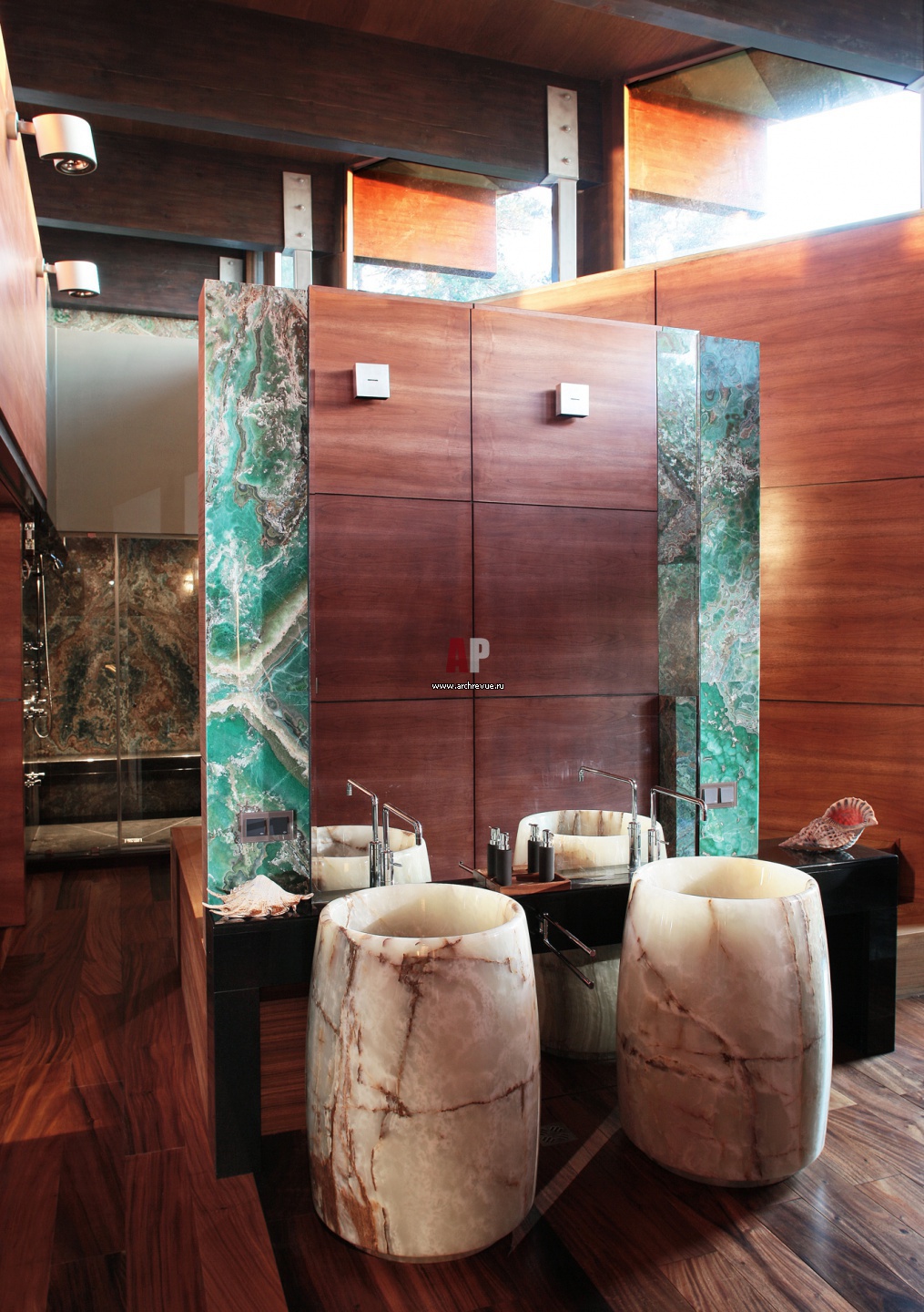 Умывальники в виде бочек сделаны из оникса. Работа с камнем Sacerdote Marmi.