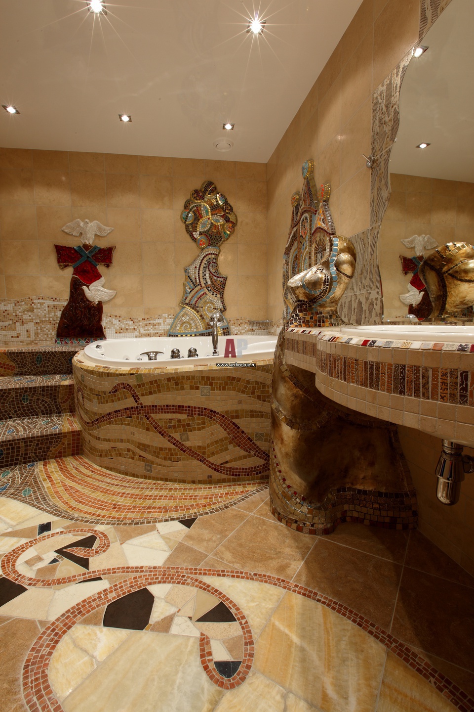 В оформлении гостевого санузла особую роль играет растительный орнамент, мозаичная волна которого заходит из холла. Орнамент развивается, поднимаясь вверх. Чем выше, тем ближе к доминанте – к вариациями на тему Гауди.