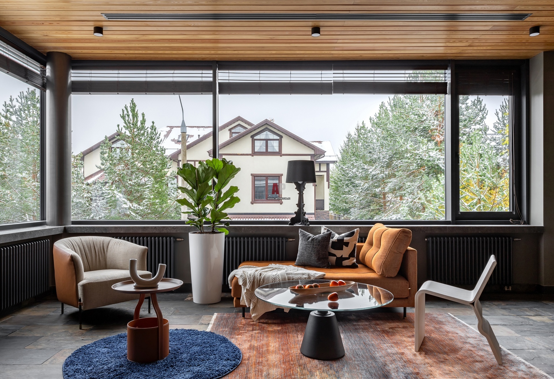 Лаунж в СПА-зоне на втором этаже. Просторная зона отдыха с кушеткой и мягким креслом, журнальным столиком BoConcept на толстой ножке с парящей стеклянной столешницей и огромными окнами, наполняющими весь этаж светом и ощущением воздуха.
