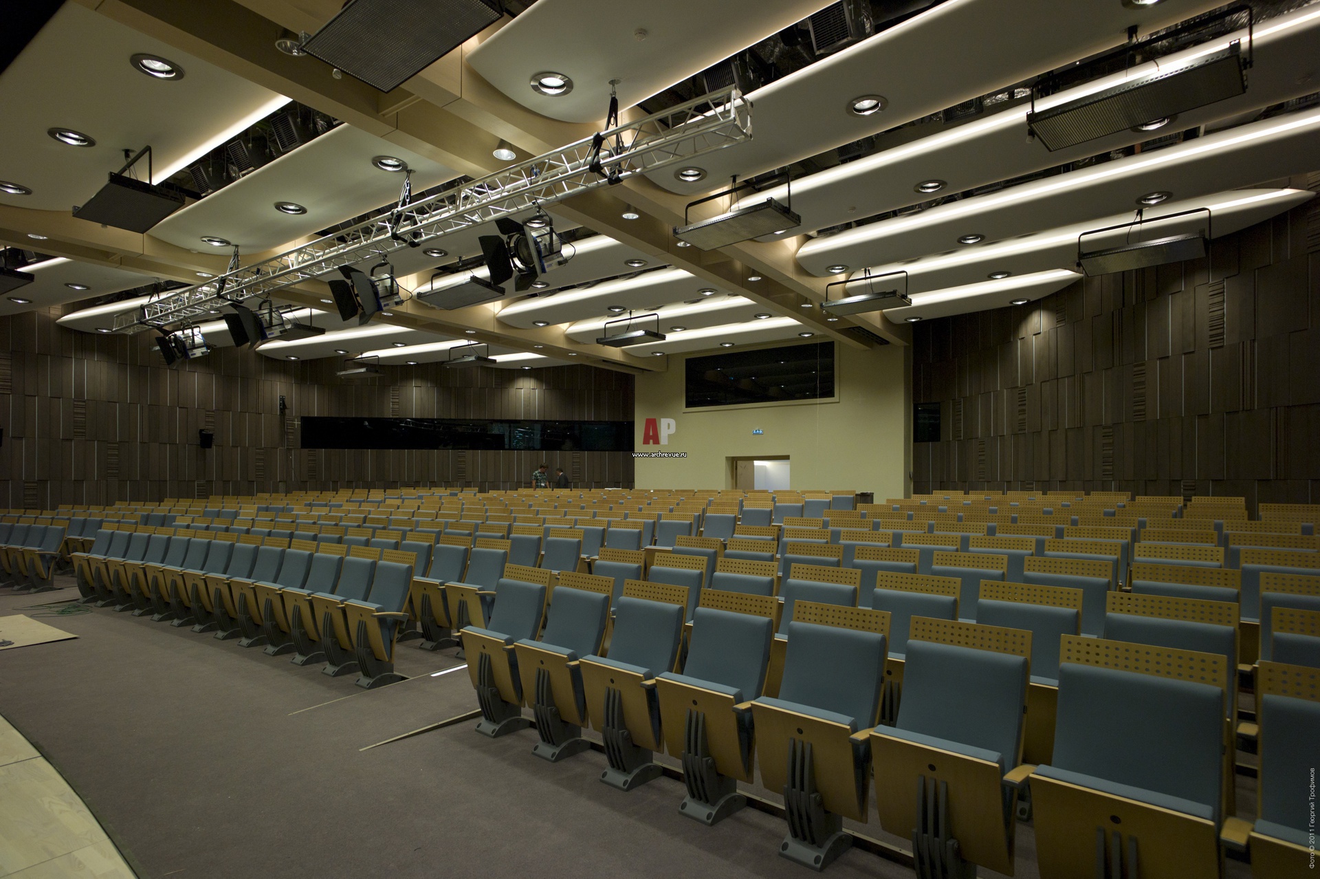В пространство зала заложена возможность трансформации. Все кресла можно убирать. Кресла фабрики Figueras, поставка и монтаж Pronto-Seating. Акустические потолочные линзы, изготовление и монтаж i-Textile.