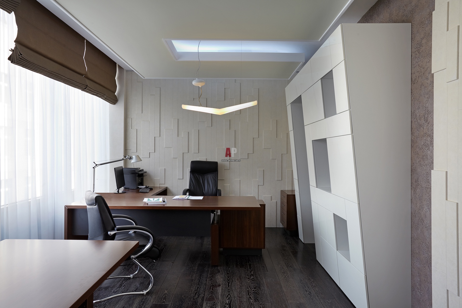 На фото – интерьер рабочего кабинета в современном стиле. Стена за рабочим столом выглядит рельефной: она оформлена деревянными панелям и выкрашена в белый цвет. Портал входной двери с композицией из стеллажей сделан наклонным.