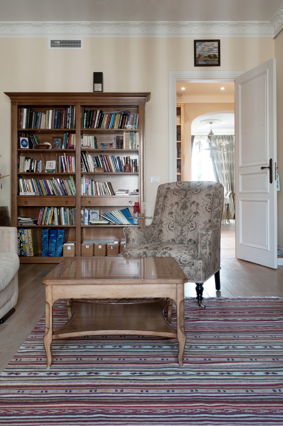 Фото зоны библиотеки в женском кабинете. Книжный стеллаж, журнальный стол, кресло, Grange.