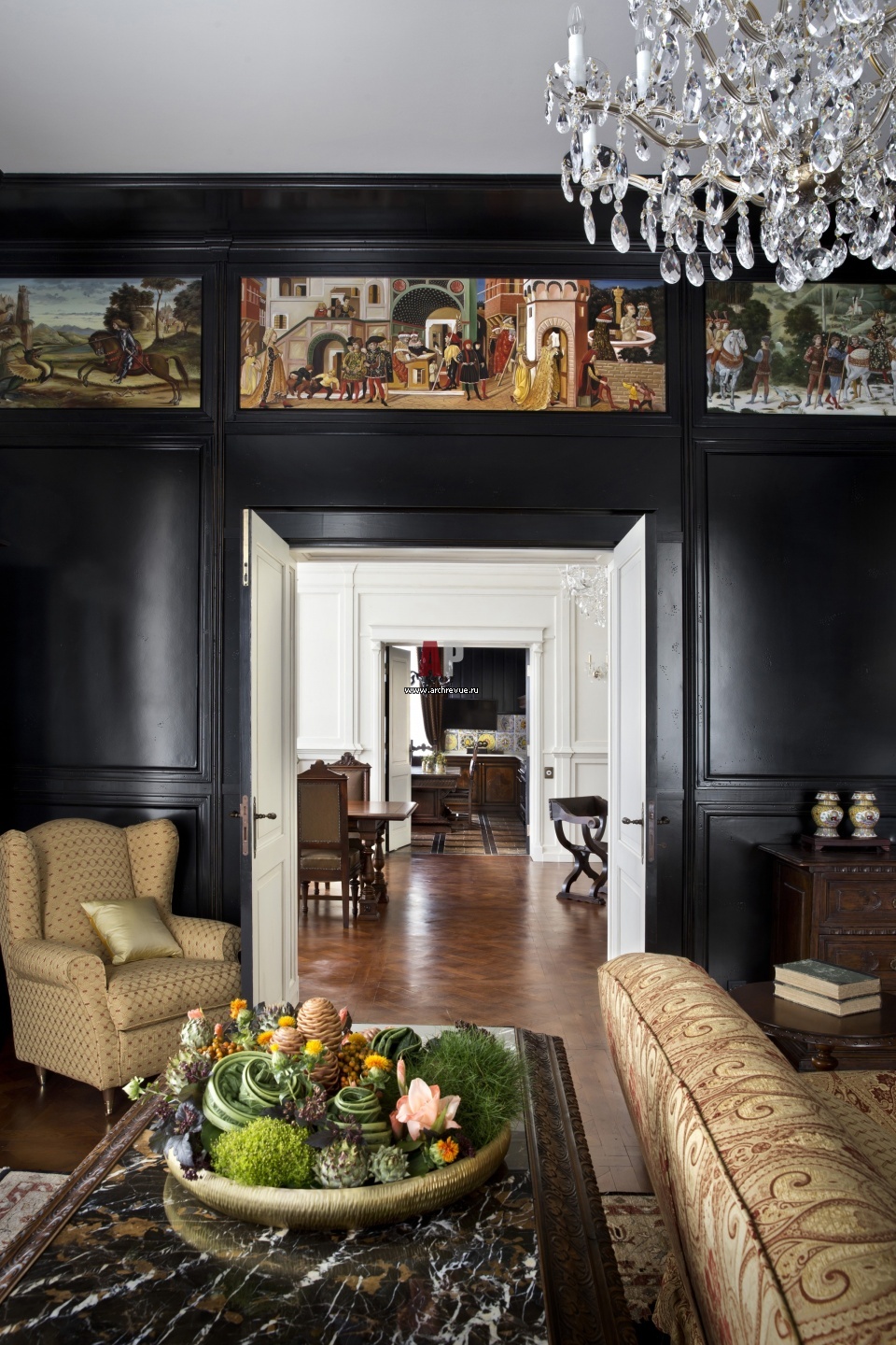 Вид из гостиной на столовую и кухню. Стены зашиты буазери из бука, декоративный фриз выполнен в живописной технике (холст, масло). В основе сюжета – работы итальянских мастеров эпохи Возрождения. Ковер-чуби, ручная работа.