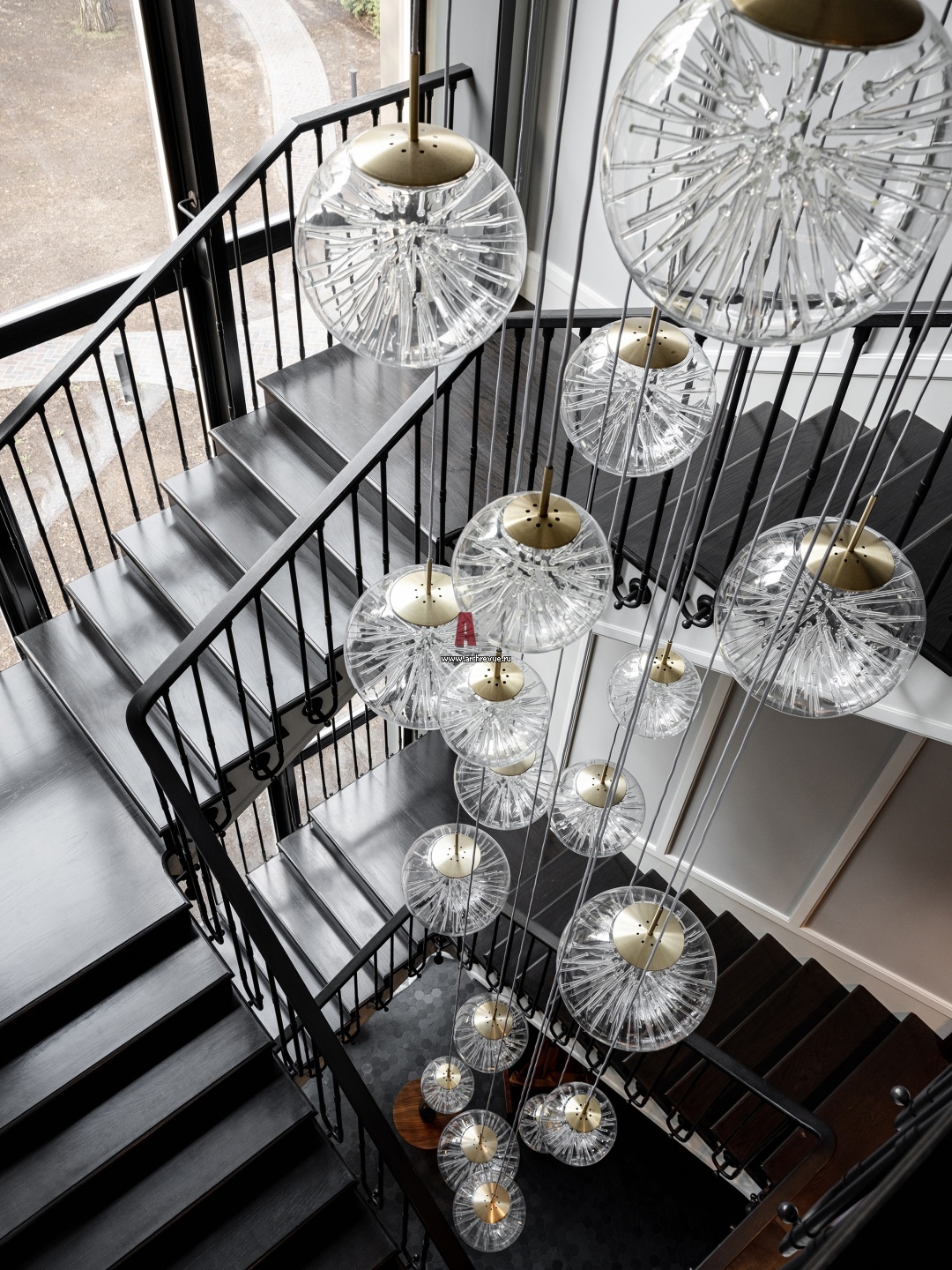 Необычная лестница с ограждением из вороненой стали сделана по чертежам архитекторов. Авторская люстра, Isabel Hamm – едва ли не главный арт-объект этого дома.