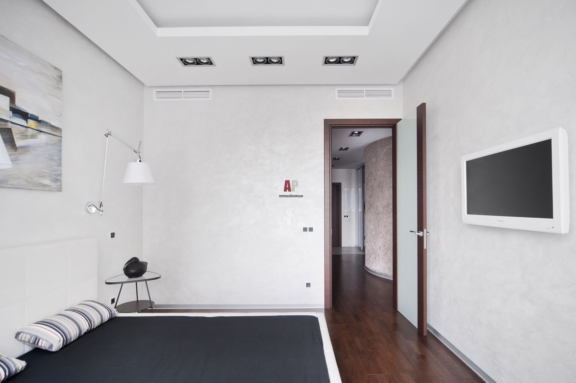 Современный интерьер спальни выполнен в белом цвете. Стены декорированы фактурными штукатурками с перламутром.