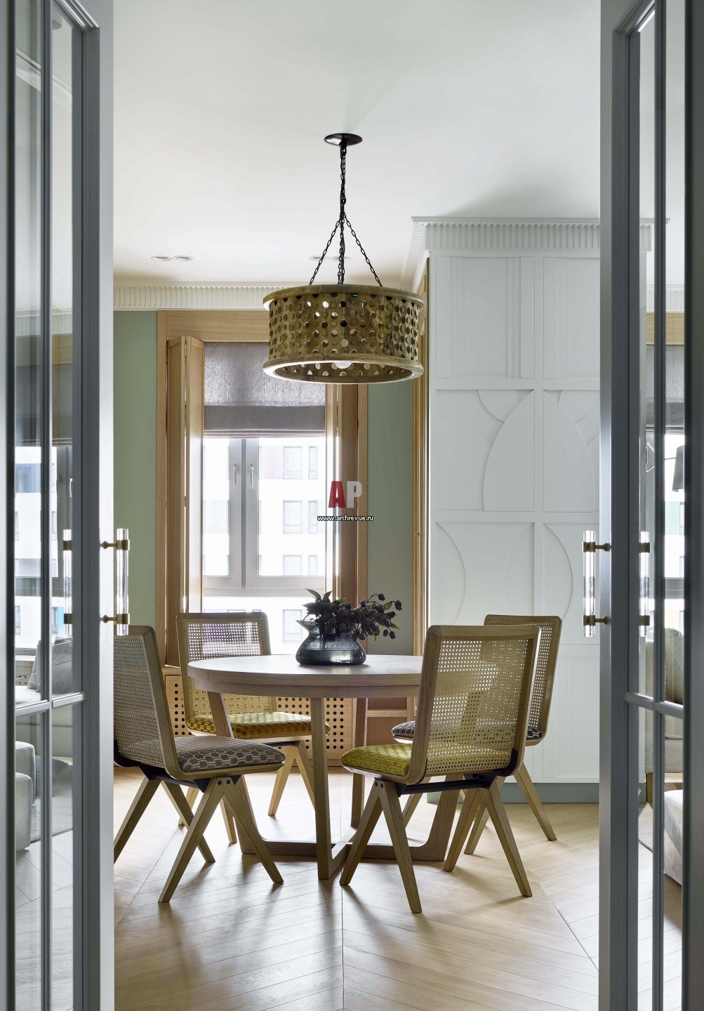 Кухню и гостиную связывает настенное гипсовое панно с абстрактным рисунком. Обеденный стол, на заказ. Стулья с ротанговым плетением, Roche Bobois. Люстра над столом выполнена из дерева, выловленного в океане, Arteriors.