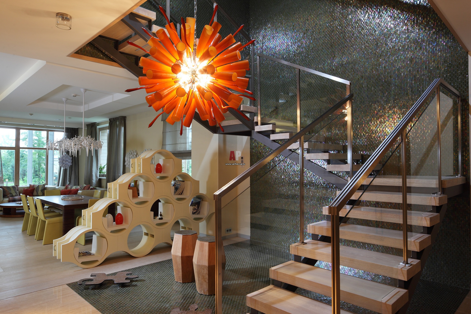 Лестница выполнена из стекла и металла. Она сделана на заказ на итальянской фабрике Alfa Scale.