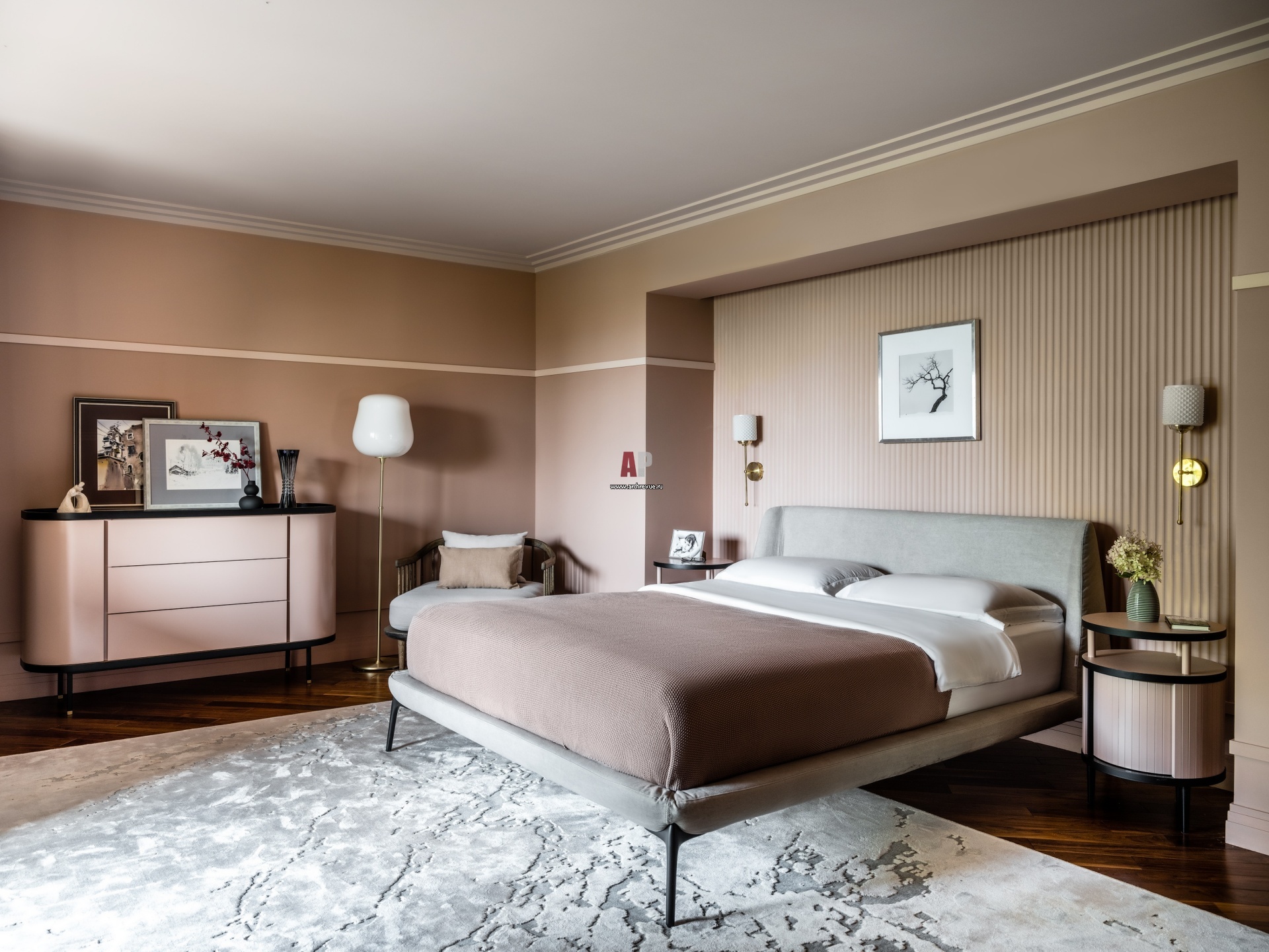 Хозяйская спальня оформлена в пудрово-розовой палитре. Кровать, Novamobili. Кресло, &Tradition. Тумбы и комод Mooshie, по эскизам автора проекта. Ретро-светильники, Factory232.