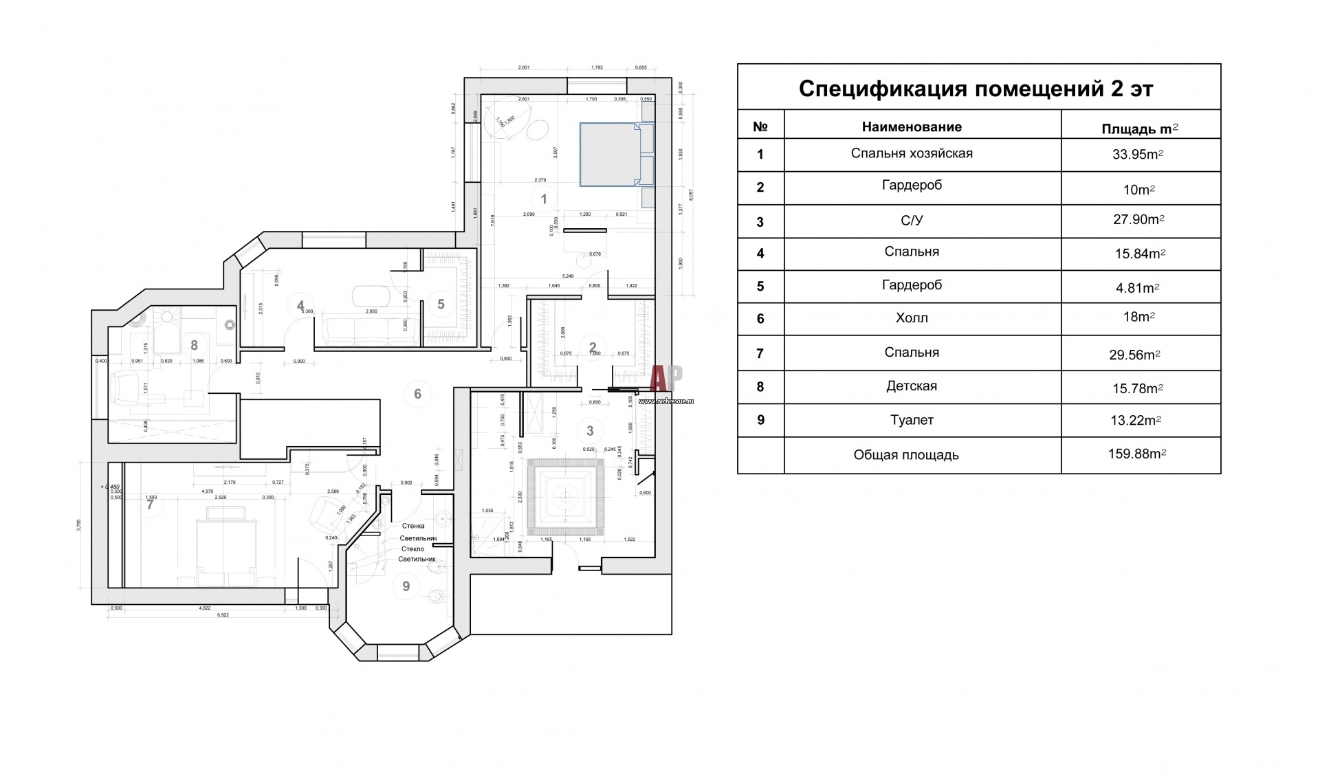 План второго этажа с расстановкой мебели 2-х этажного дома площадью 350 кв. м.