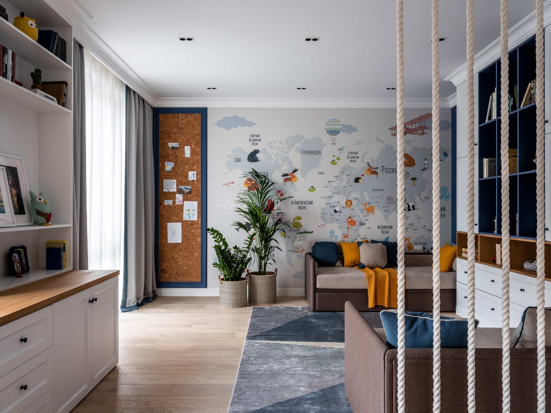 Детская комната. Обои с изображением карты мира, Ko'Za Home. Канатный городок сделан на заказ.