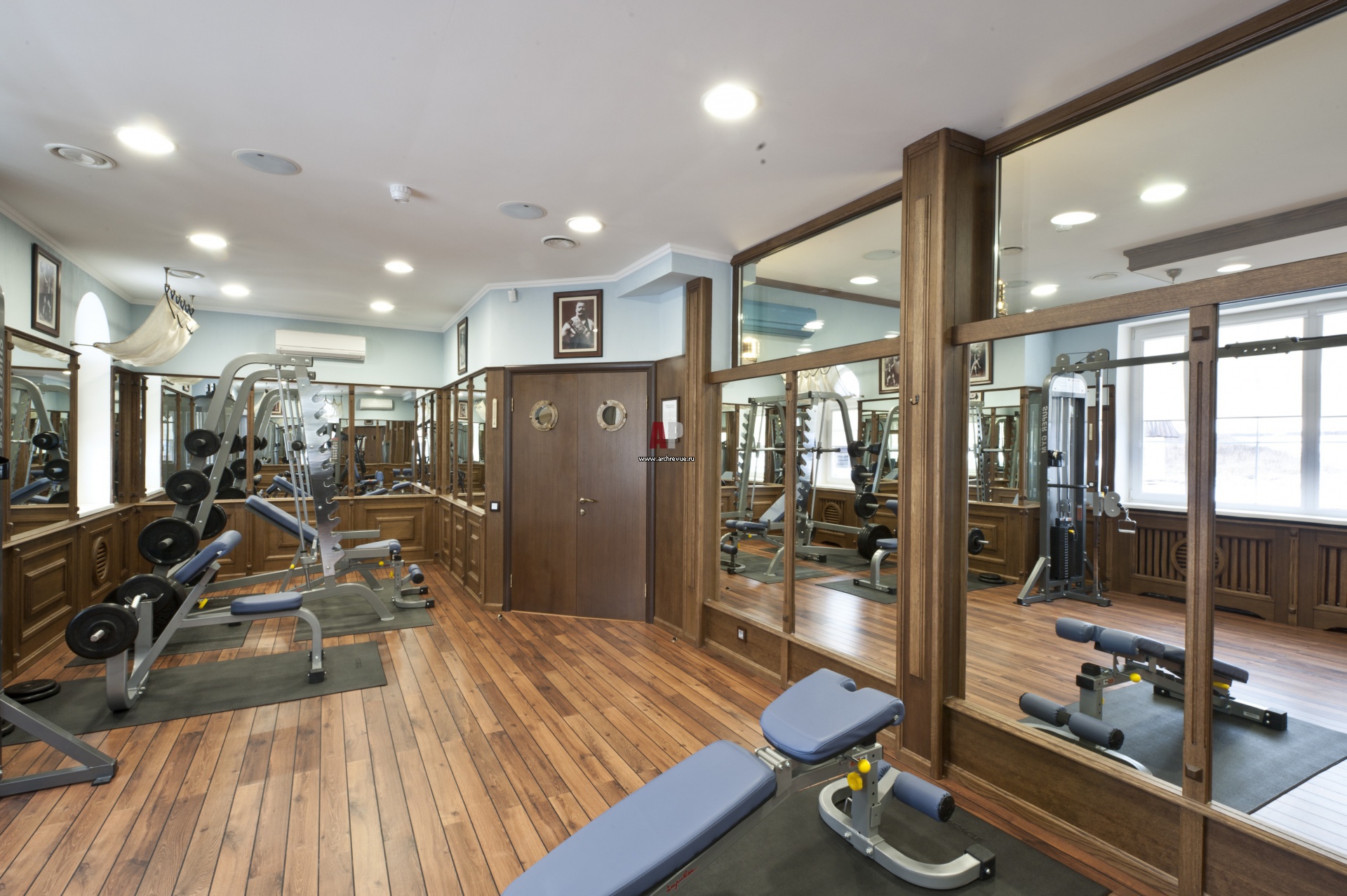 Дизайн тренировочного зала в морском стиле решен с использованием деревянных панелей. На полу – ламинат, имитирующий палубную доску.