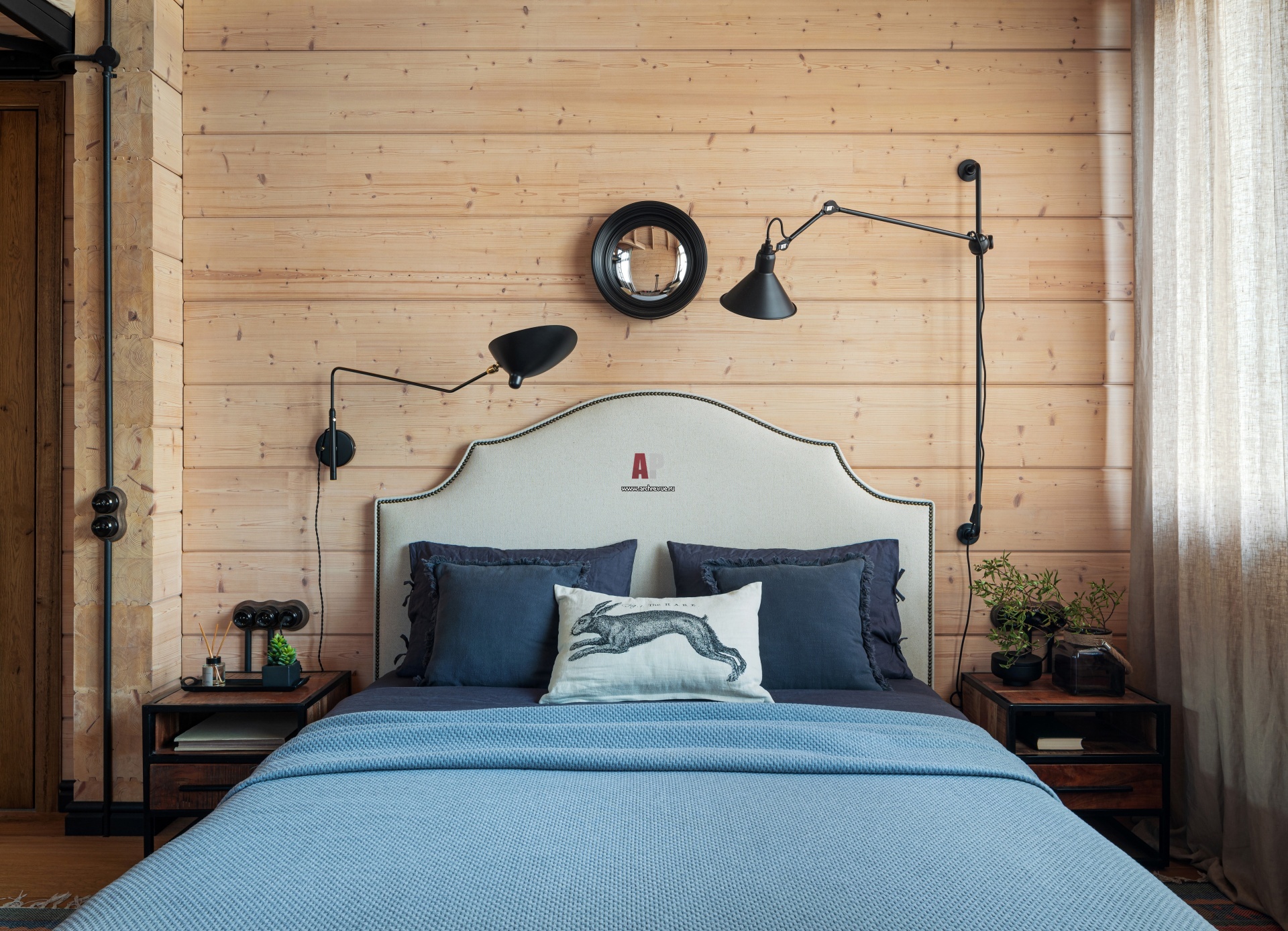 Одна из двух детских. Практически все стены 2-го этажа из соснового бруса были оставлены в первозданном виде. Пришлось тщательно подбирать масло для обработки бруса, чтобы стены приобрели нужный оттенок, но выглядели при этом не обработанными.