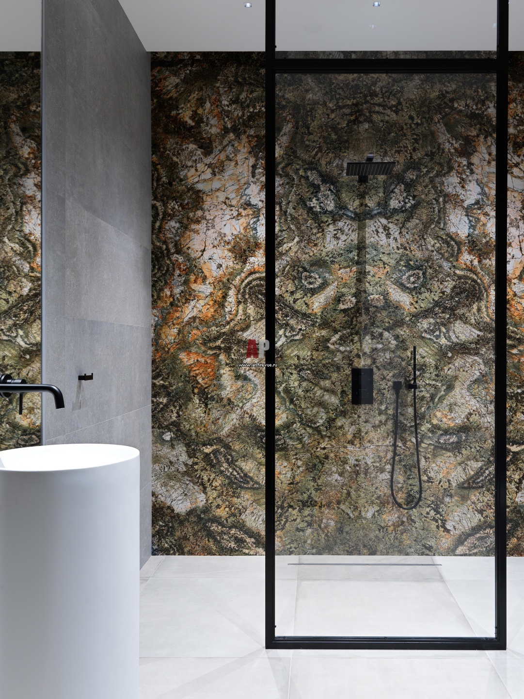 Акцент ванной комнаты – панно из искусственного камня в душевой кабине. Керамогранит, Porcelanosa. Черный смеситель и душевой комплект, Warmer, коллекция модель Black Line Cube.