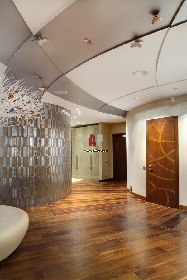 Радиусная стена облицована плиткой с перламутром. Двери с растительным орнаментом выполнены на заказ из мультишпона ореха, изготовление «БКС». На рельефных потолках порхают бабочки и стрекозы.