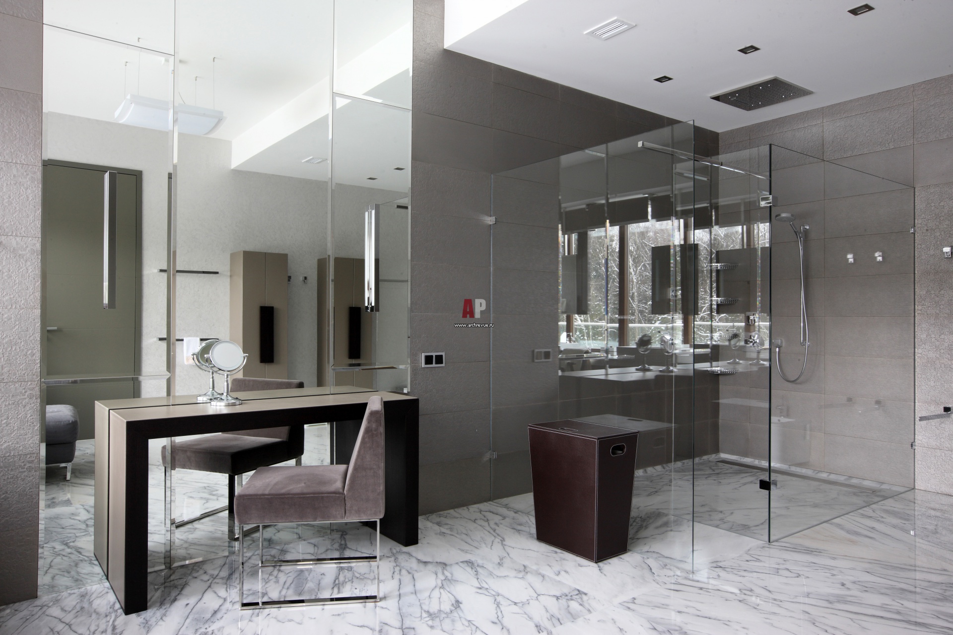 Интерьер современной ванной комнаты в светло-серой гаме. На полу – плиты из мрамора Volоkas, на стенах – керамогранит Apavisa с серебристым напылением. Чтобы на плитке не оставались разводы, авторы проекта покрыли ее специальными пропитками. Перегородки душевой кабины из прозрачного стекла.