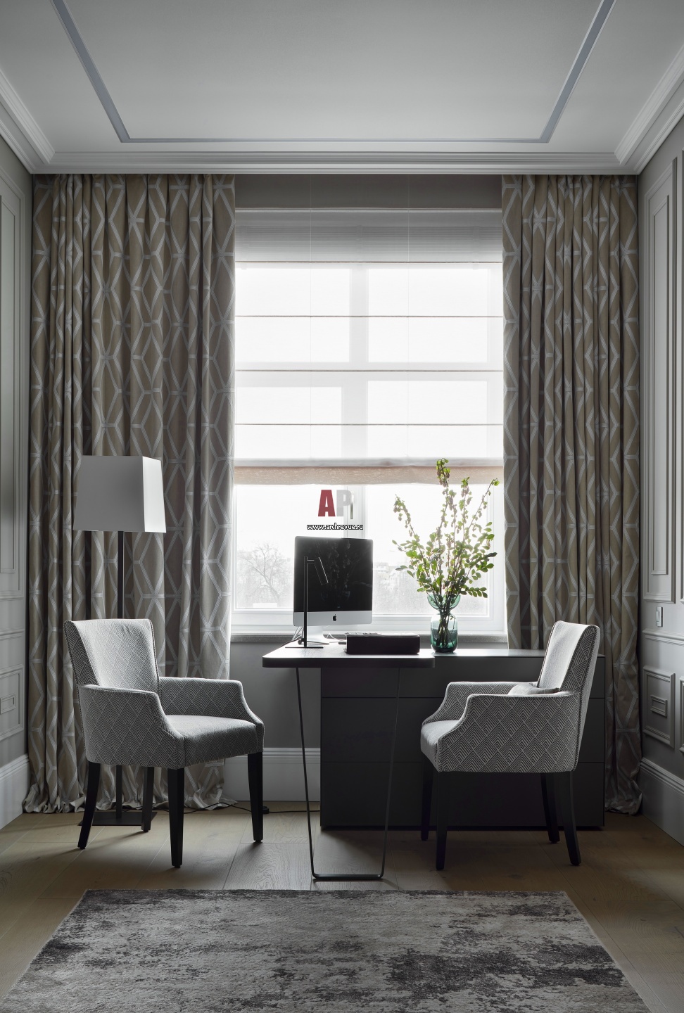 Кабинет получился большим и удобным. Он задумывался как место, где можно заниматься с репетитором одному или нескольким членам семьи сразу. Письменный стол, Alf DaFre. Стеллаж, Line Gianser.