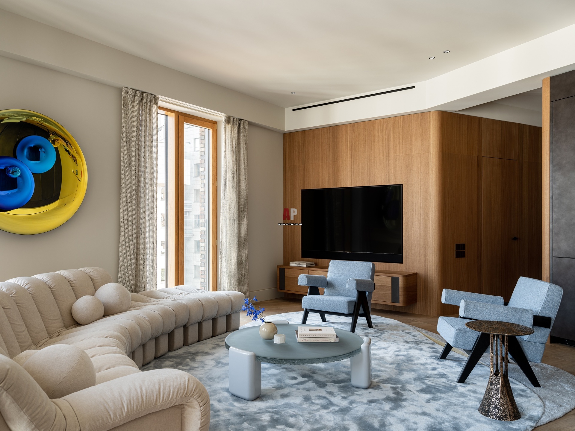 Гостиная с зоной ТВ. Стена отделана шпонированными дубовыми панелями теплого оттенка.