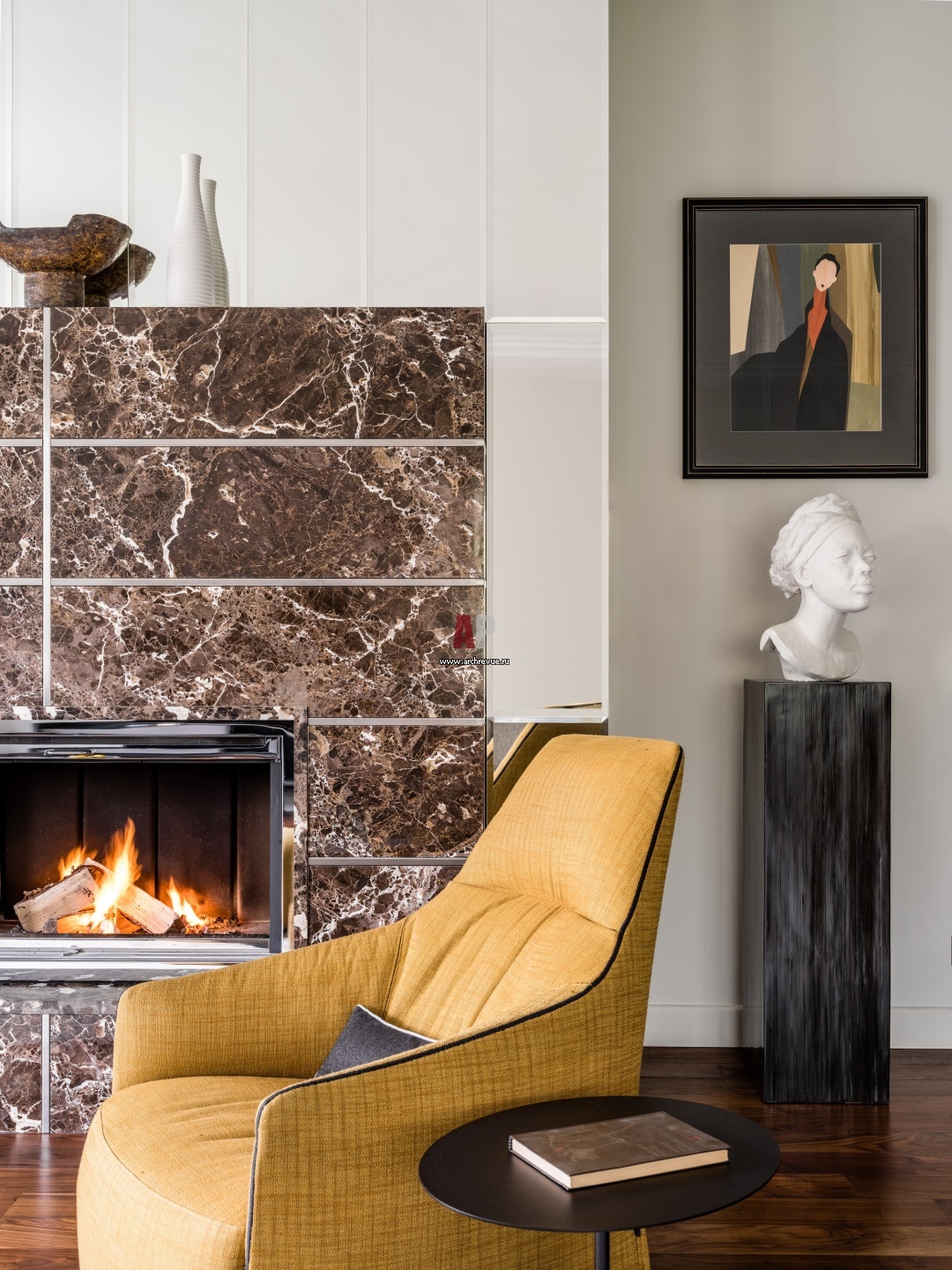 Реконструкция дома в Новой Москве. Гостиная. Кресло, Poliform. Гипсовая скульптура в виде женской головы – работа хозяйки дома.