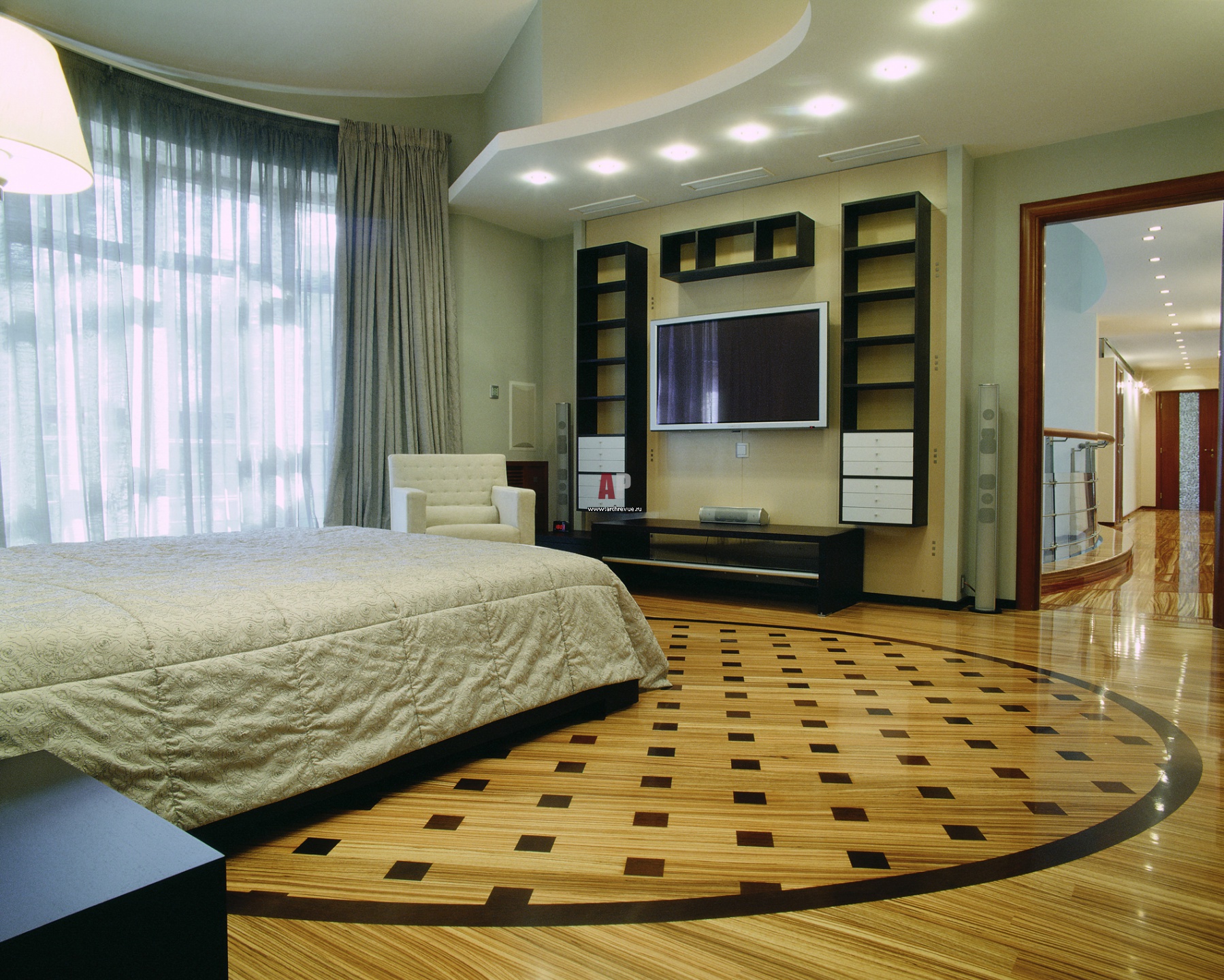 В спальне выразительный потолочный круг повторен в рисунке пола. Поставщик паркета, «Ковчег-паркет».