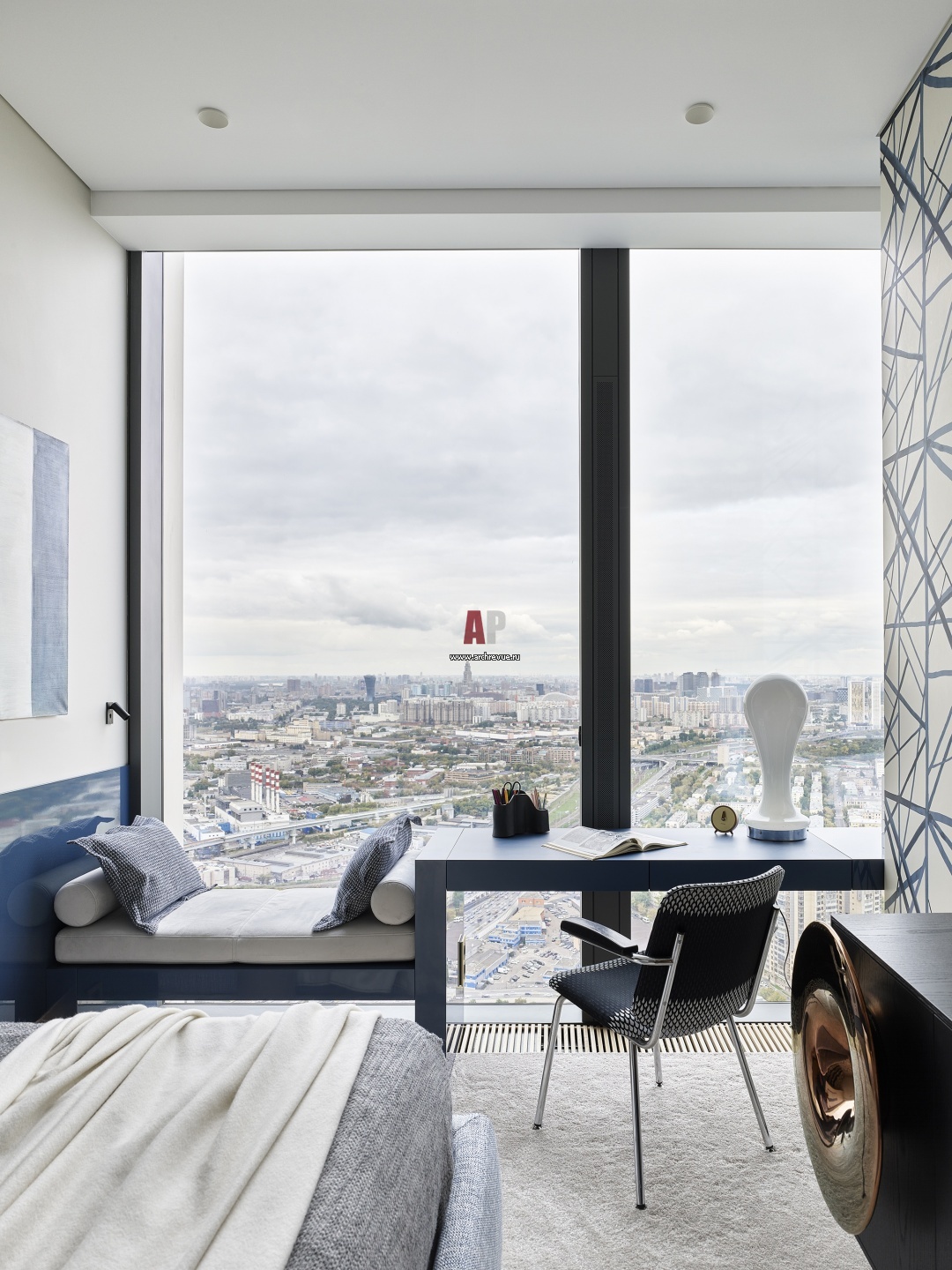 Комната сына. Возле панорамного окна – рабочий стол с диваном в синем дизайне.