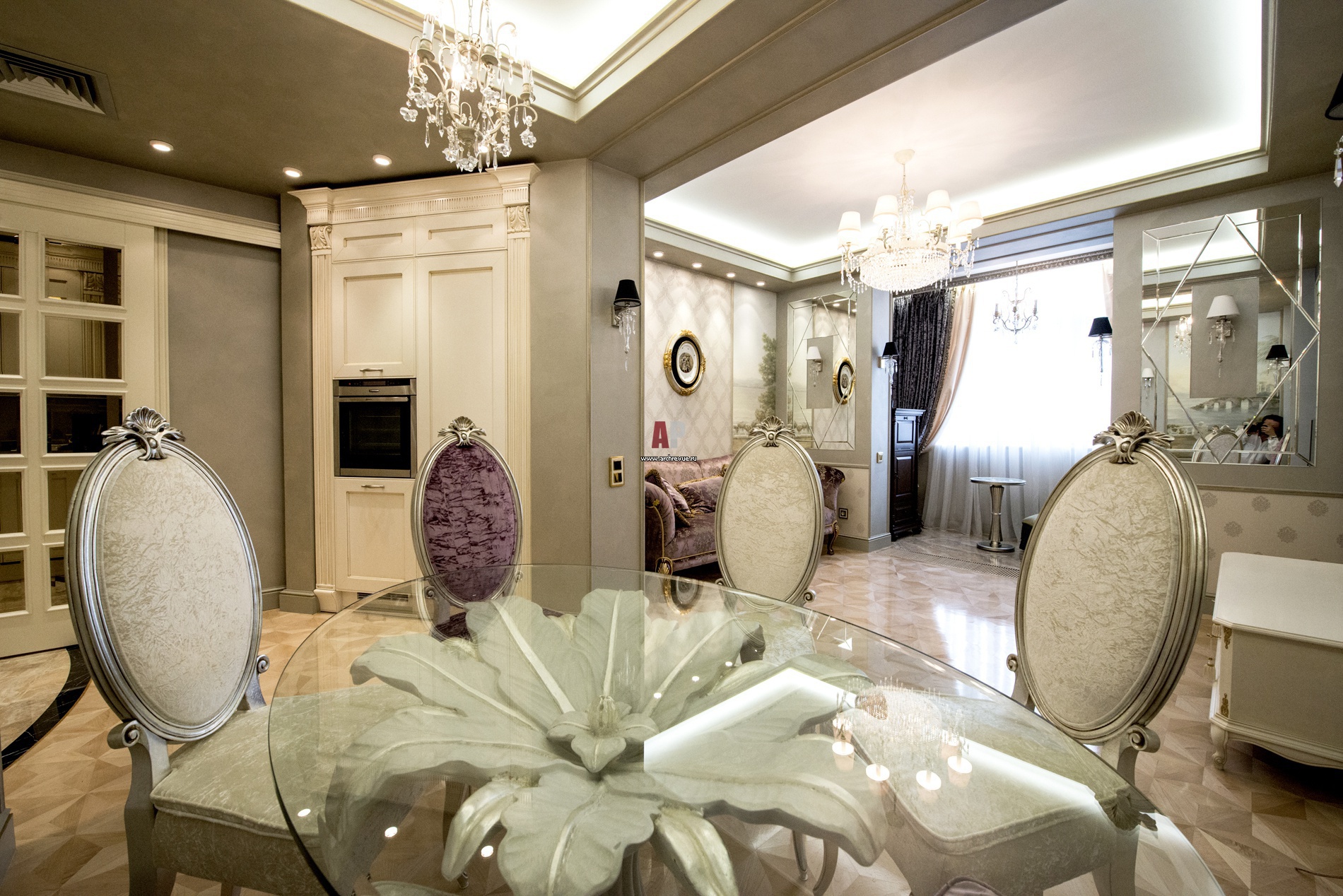 Зона столовой объединена с кухней. Кухонная мебель, слоновая косить, резьба.