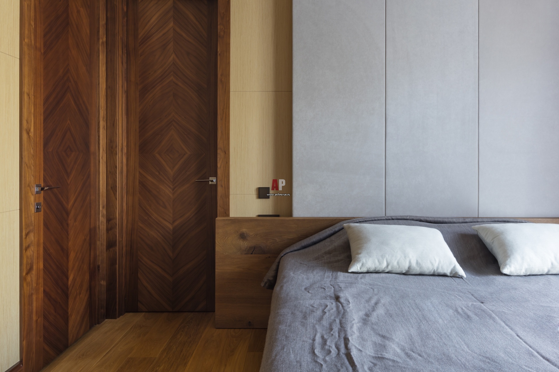 Интерьер третьей остевой спальни, стена за изголовьем кровати обита панелями из серо-дымчатой ткани. Из этой спальни можно попасть на открытую террасу, образованную надстроенным над парадным входом навесом.