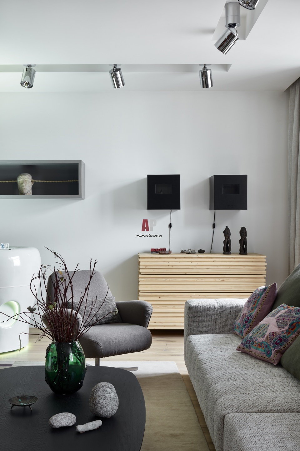 Гостевая квартира с коллекцией современного искусства. Интерьер гостиной. Комод в виде сложенных досок, Mogg, модель Ordinaryday. За музыкальным инструментом Reactable – работа Андрея Кузькина «Без названия».