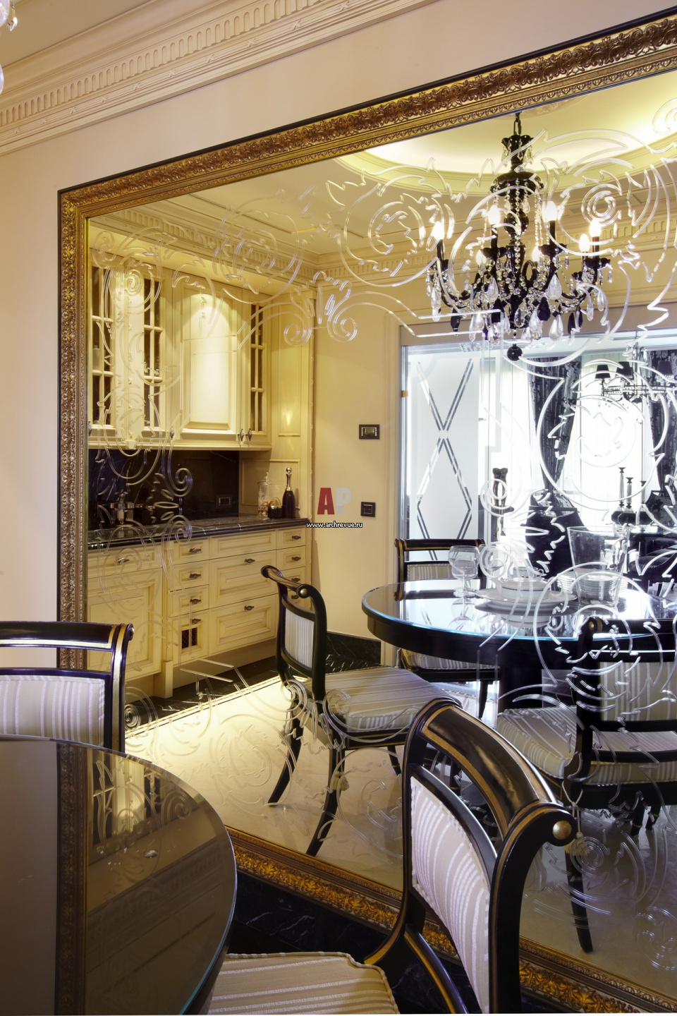 Кухня вынесена в центр помещения и не имеет окон. Нехватку естественного света компенсируют стеклянные перегородки, отделяющие ее от столовой. Стеклянные перегородки украшены гравировкой с классическим растительным декором.