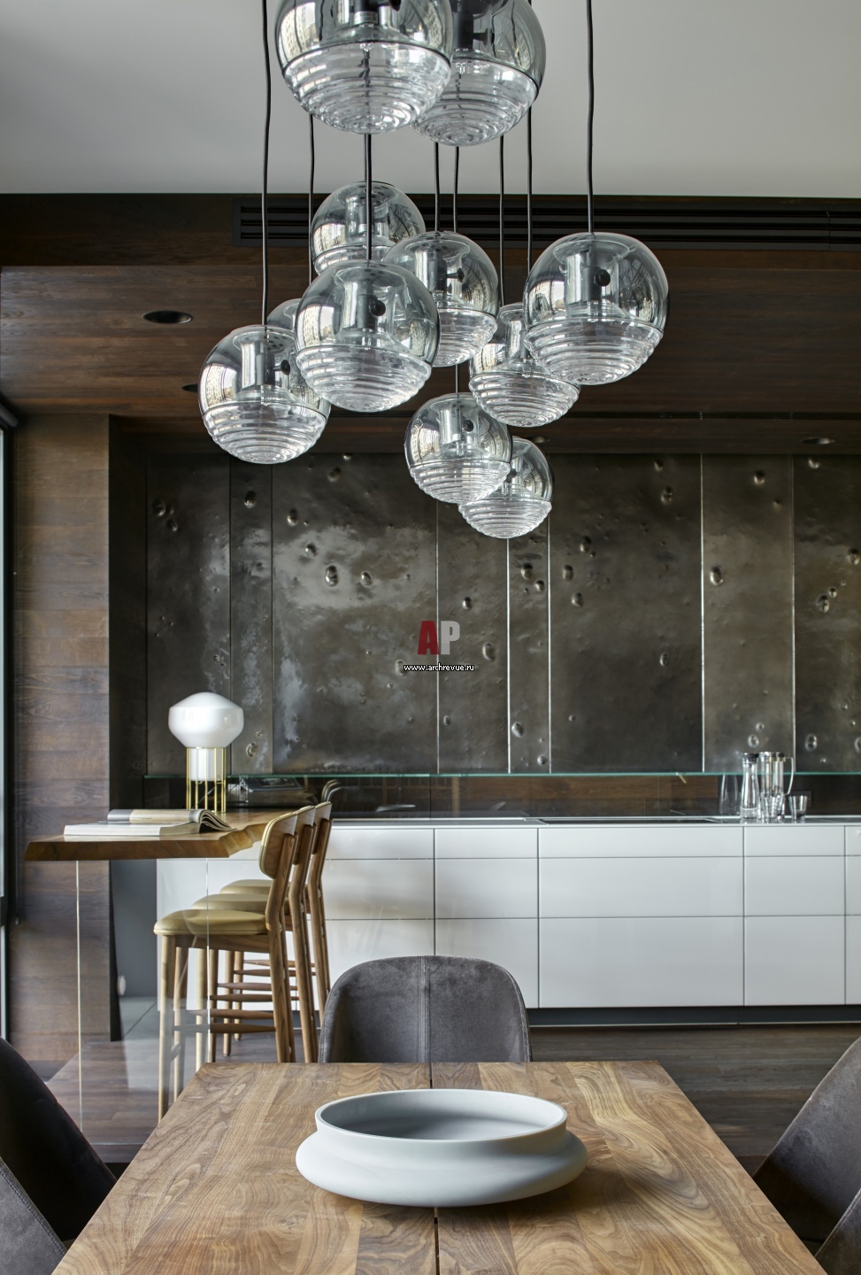 В кухне архитекторам хотелось уйти от типичной меблировки с верхними полками-шкафами. Решено было освободить всё пространство над рабочей поверхностью, а необходимое хранение встроить в высокие модули в нише. Вытяжка встроена в столешницу и выезжает при необходимости.