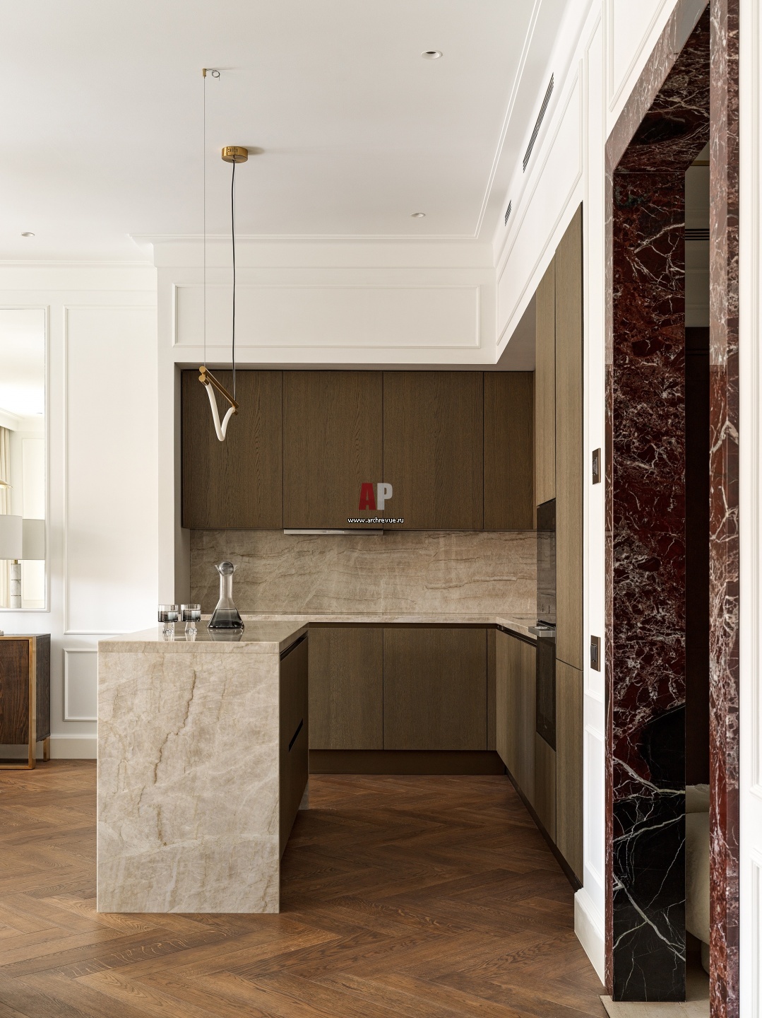 Кухня в общей гостиной получилась небольшой. На выделена темным деревом и камнем. От парадной части ее отделяет барная стойка.