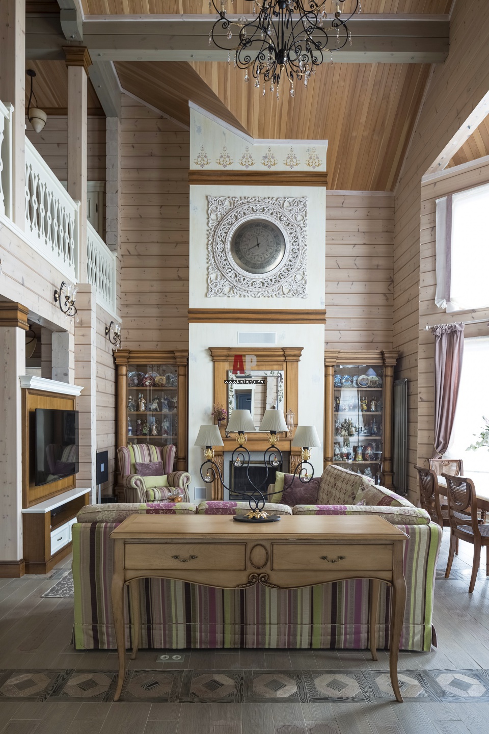 Интерьер гостиной с камином, его окраска имитирует послойное нанесение штукатурки, по верхнему фризу пущена изящная трафаретная роспись. Портал дымоходал украшен часами Dialma Brown.