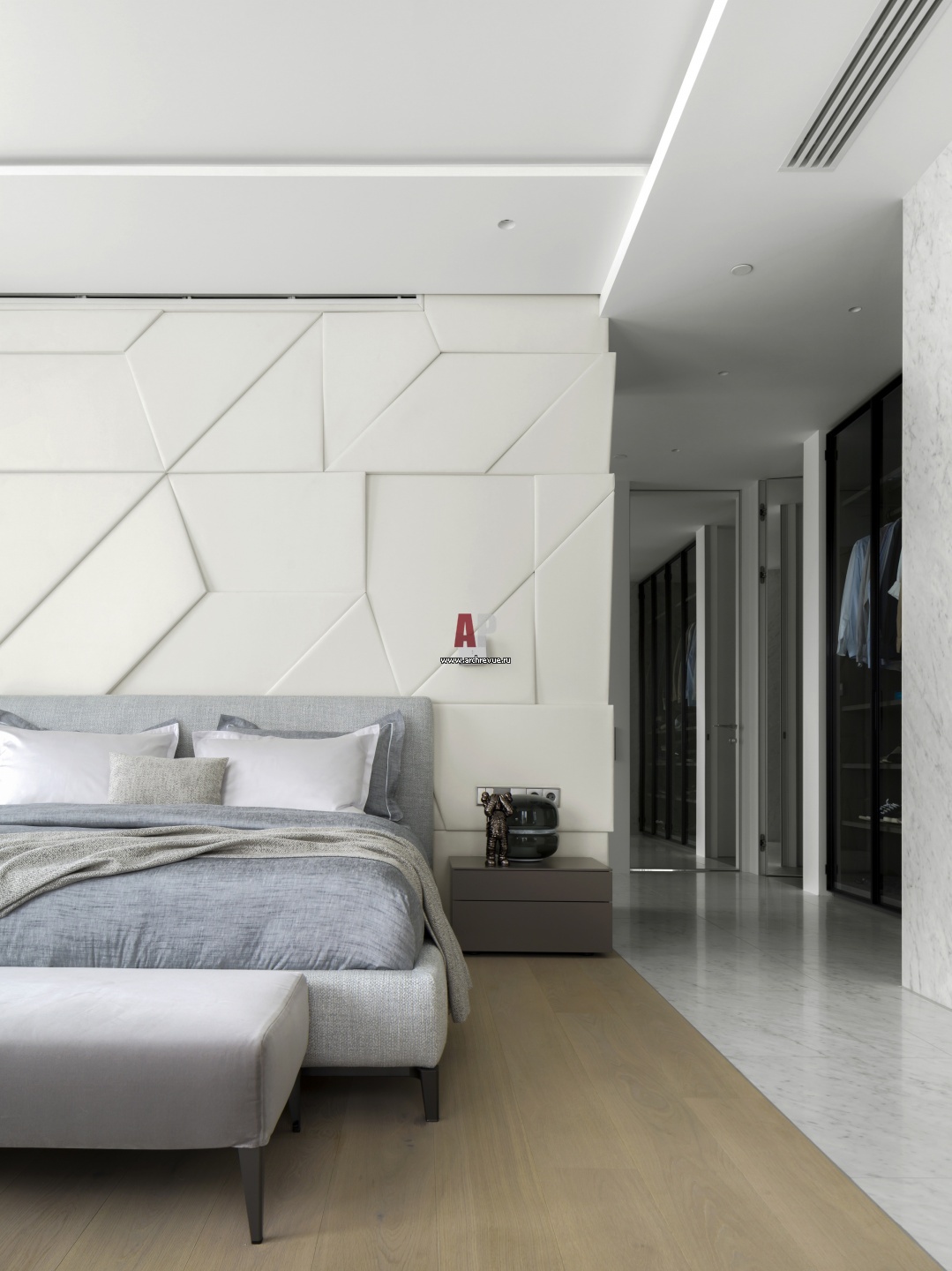 Спальня. Справа – стеклянные шкафы гардеробной. Мебель, Porro.