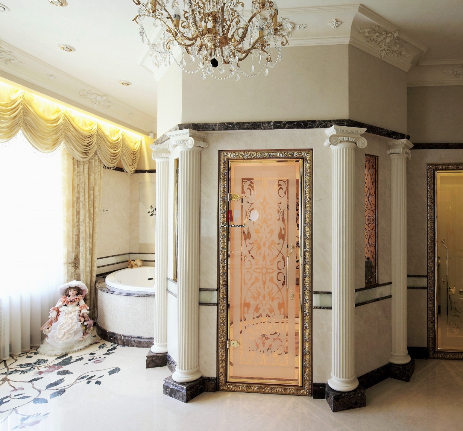 Главная ванная комната в торжественном классическом стиле.