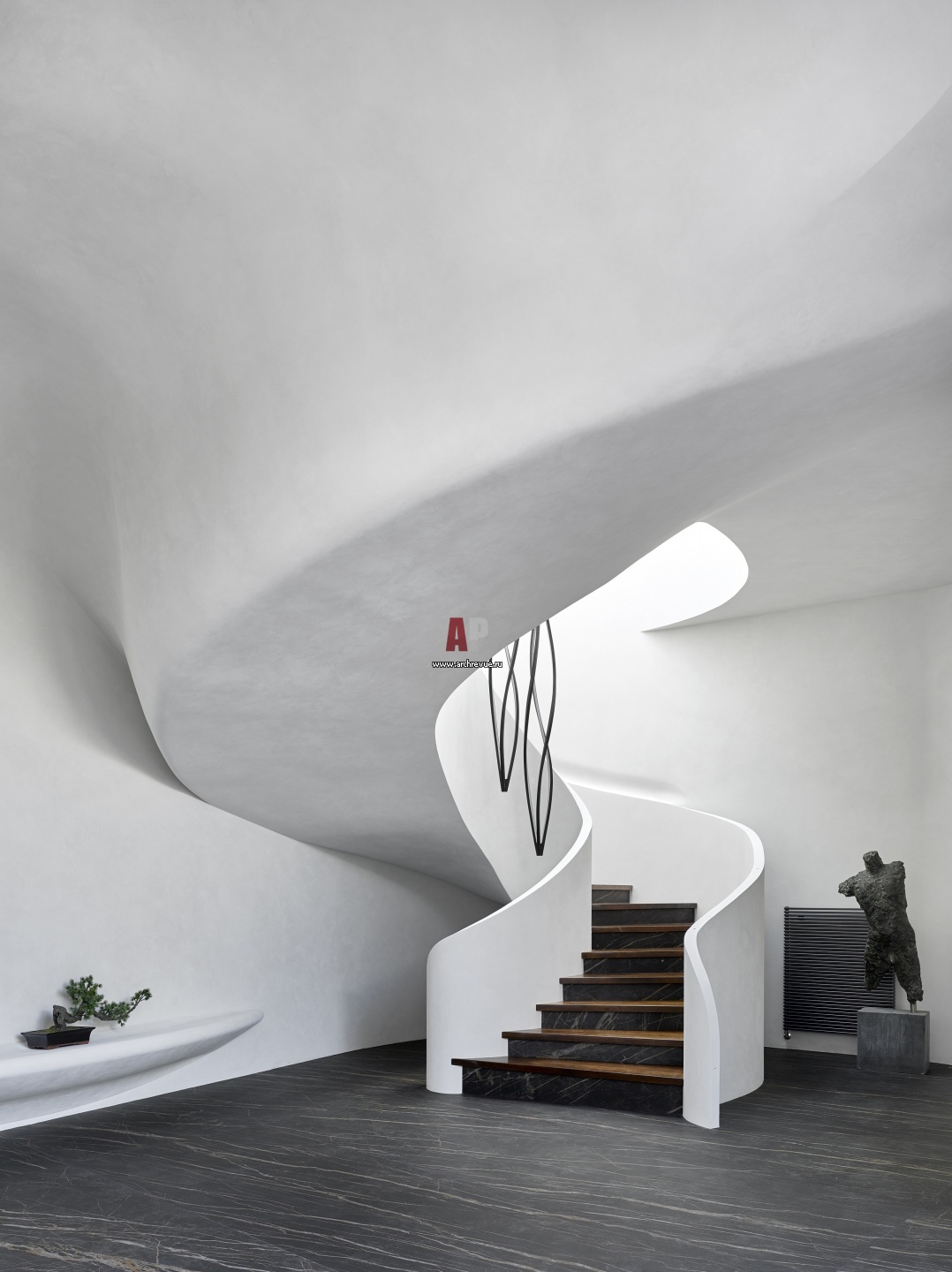 Скульптурная винтовая лестница. Конструктивная часть выполнена из бетона. Радиусные элементы выложены пеноблоками и аккуратно оштукатурены. Ступени, деревянные. Пол холла и подступенки из тонкого керамогранита темного цвета с графичными прожилками.