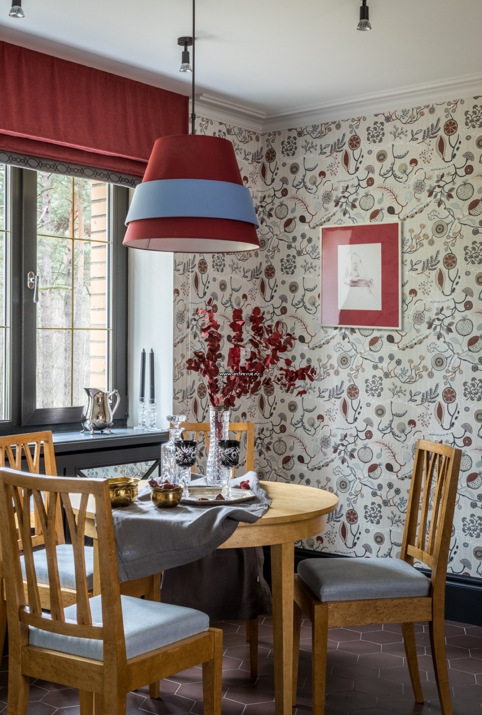 Зона для завтраков на кухне. Обои, Pierre Frey. Стол и стулья из клена «птичий глаз», сделаны на заказ.