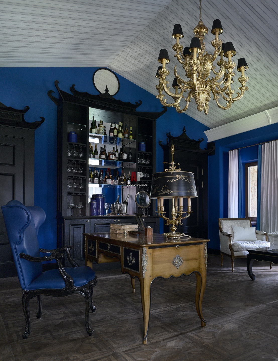 Декоративный акцент кабинета – выполненный по эскизам бар с навершием в форме китайской пагоды. Бар, мореный дуб, изготовление «Ассоциация русских мастеров».