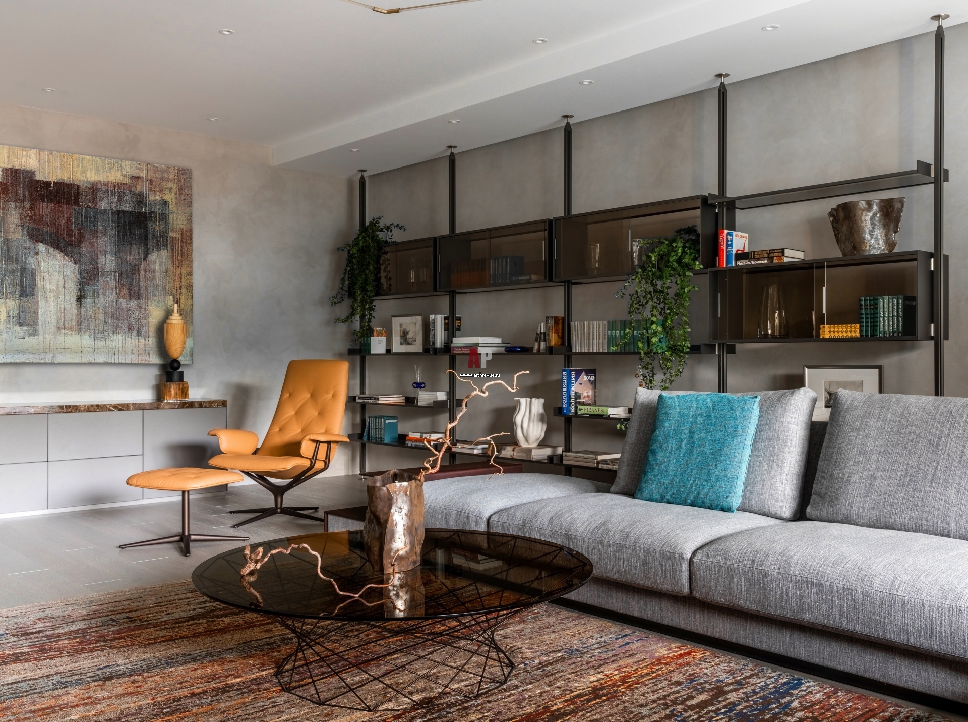 Зона отдыха в гостиной. На фоне серой бархатистой штукатурки яркими акцентами выглядят кожаное кресло Walter Knoll и работа Ольги Шагиной. Керамика, Светлана Левадная. Деревянная скульптура, Злата Корнилова.