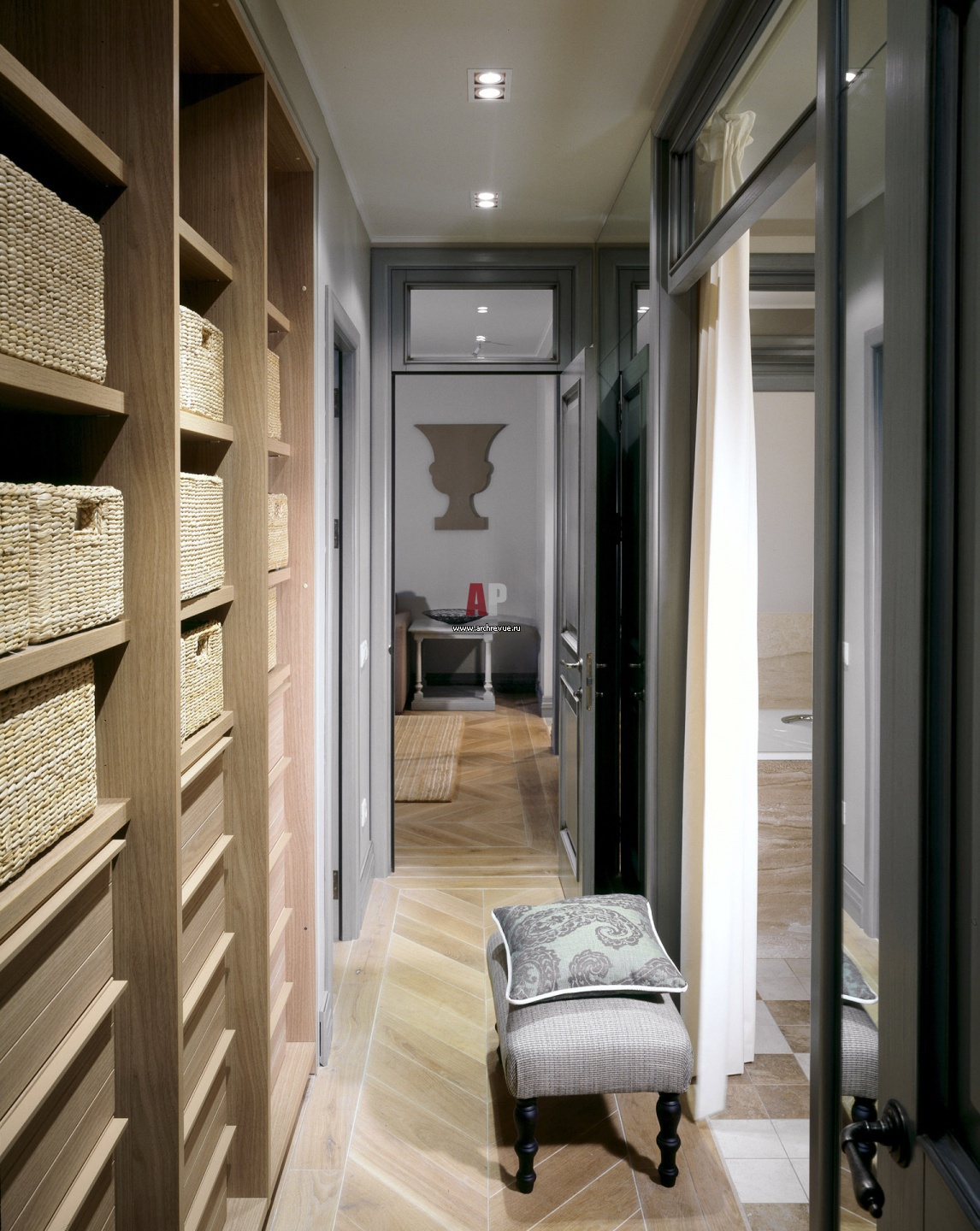 Гардеробная устроена в небольшом коридоре. Она представляет собой открытые стеллажи без дверей. Предметы хранятся в плетеных корзинах для хранения вещей.