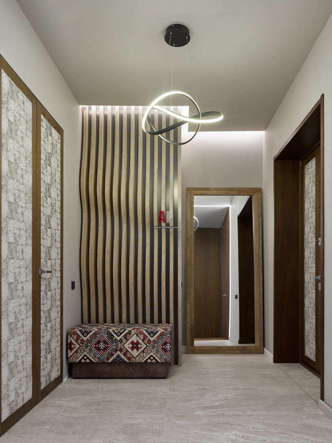 Прихожая со светлыми стенами отсылает к скандинавскому дизайну, пуф в яркой восточной обивке ассоциируется с традиционными этническими интерьерами. Гардеробная оформлена волнообразной перегородкой из выбеленного дерева с верхней подсветкой.