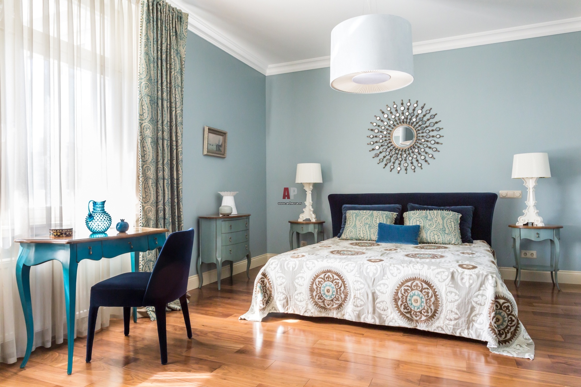 Интерьер спальни решен в стиле фьюжн. Современная кровать и стул Maxalto, настольные прикроватные светильники Kartell скомбинированы с классическими французскими комодами Labarere.