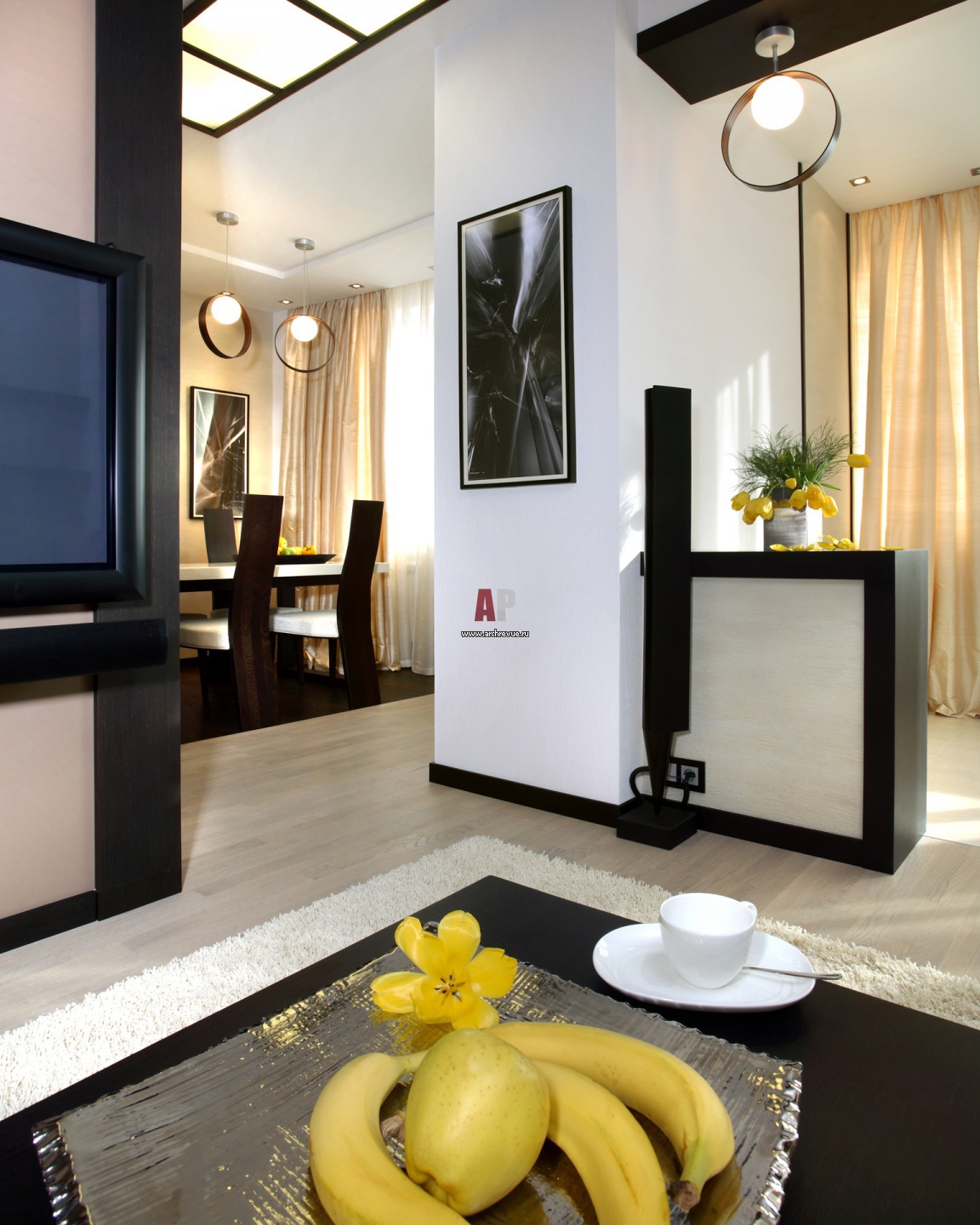 Вид из гостиной на столовую группу. Светильники-шары в круглой деревянной раме.