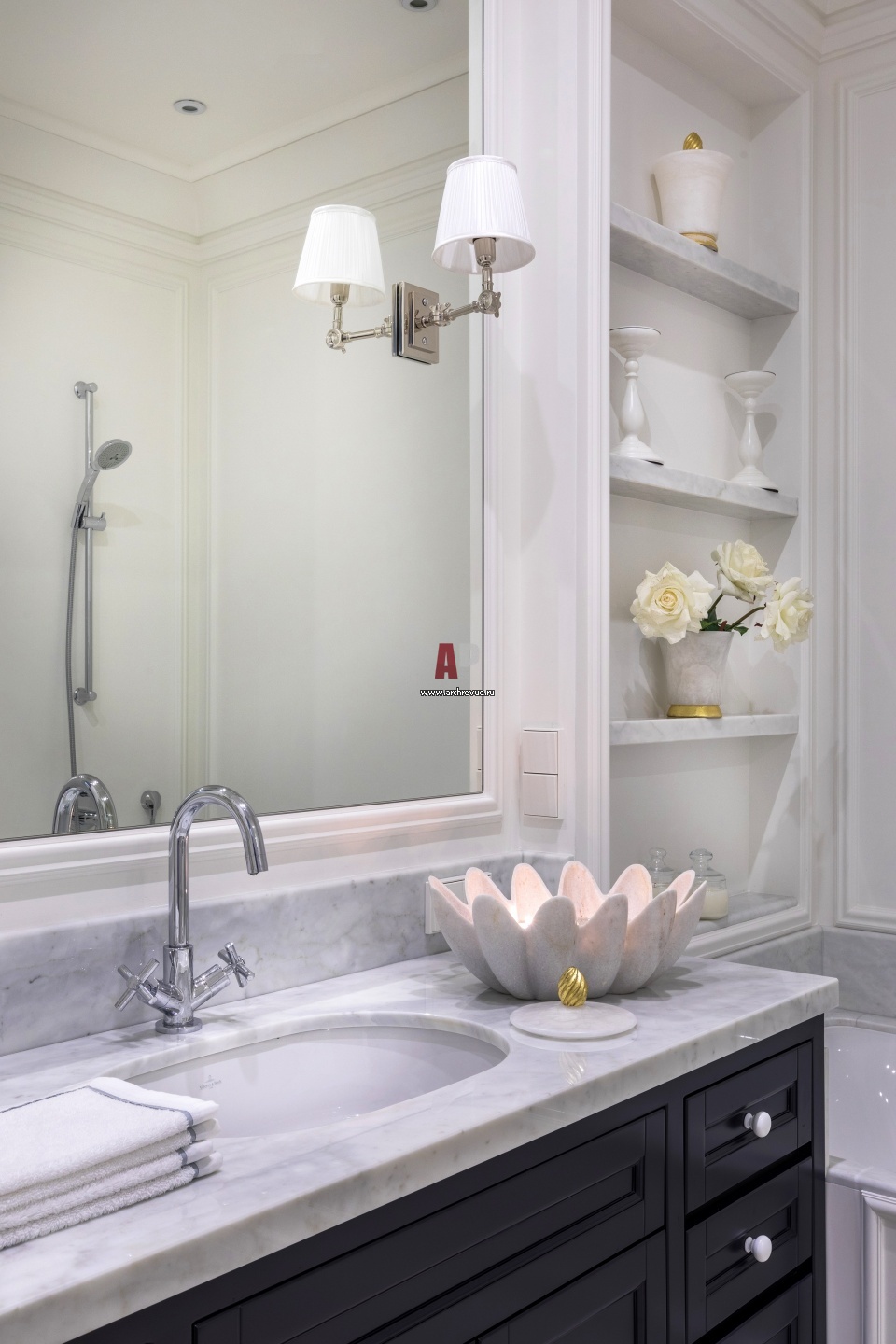 Спокойная квартира с яркими деталями. Хозяйская ванная комната. Столешница умывальника выполнена из светлого серого мрамора. Раковина, Villeroy & Boch.