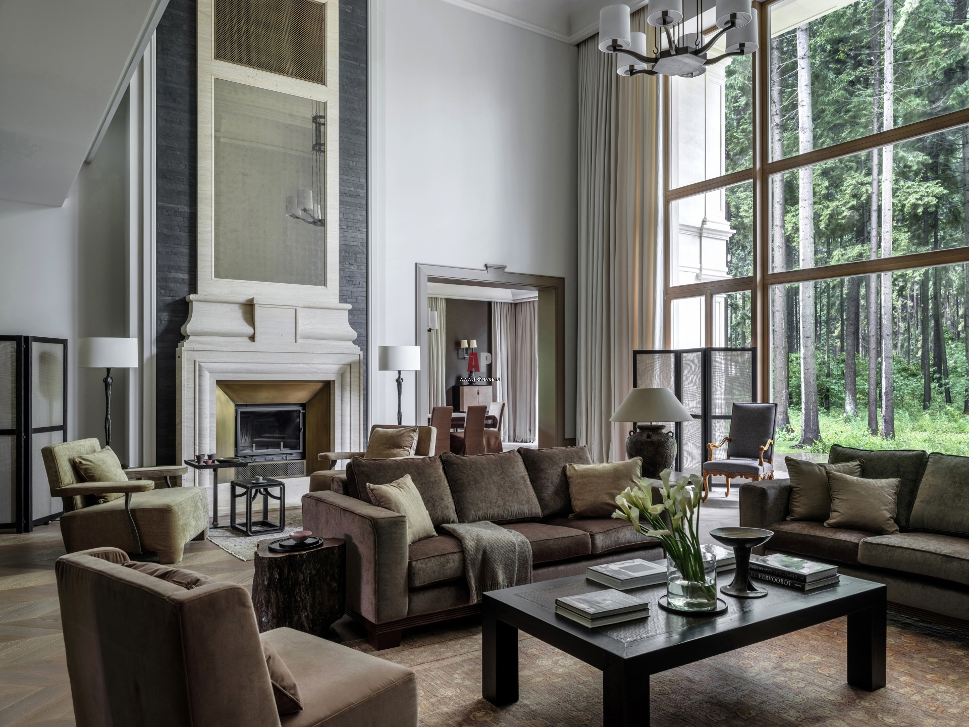 Двусветная гостиная с массивным камином. В ее оформлении использовалась антикварная и искусственно состаренная мебель. Люстра, Lorenzo Tondelli.
