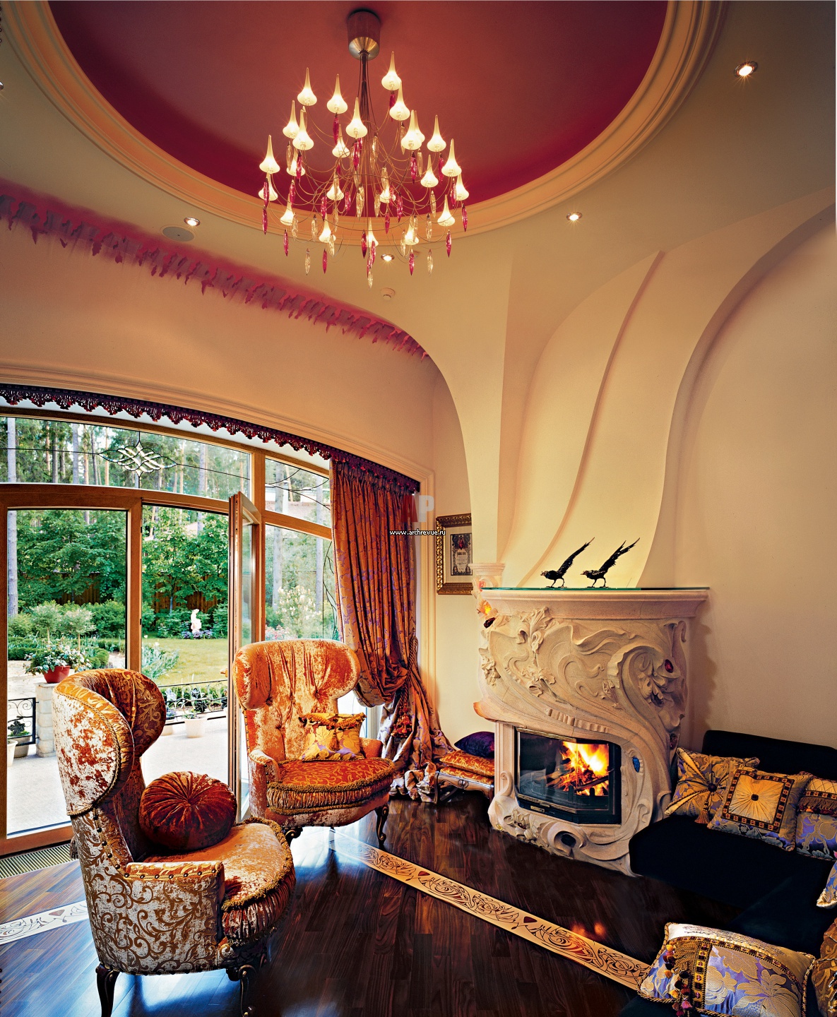 Каминный зал расположен в помещении с эффектными арочными витражами до пола. Гармония линий, естественная нежность колорита интерьера, легкость деталей – характерные особенности интерьера. Встраиваемые конвекторы, Moehlenhoff.