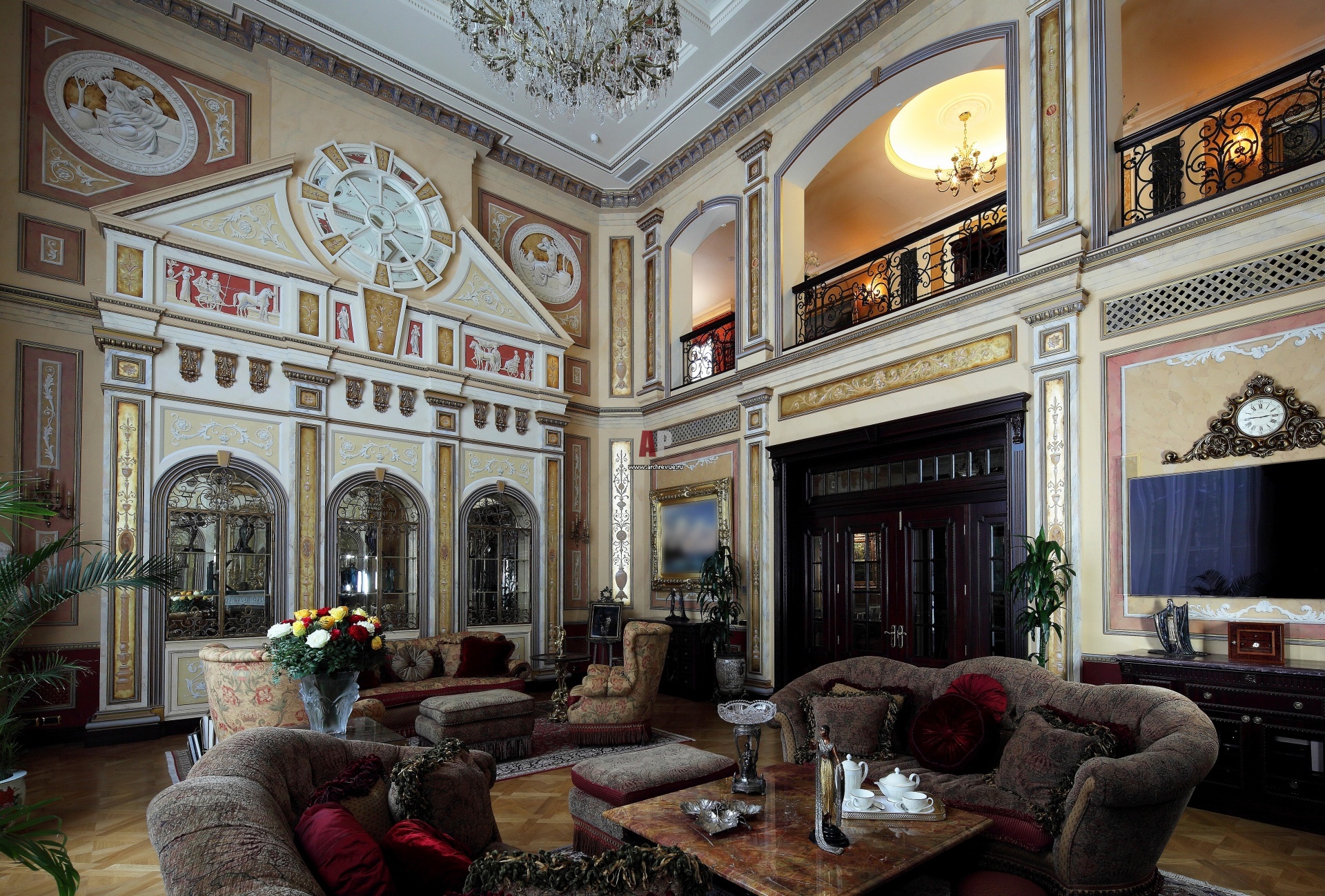 На одной оси с порталом, маскирующим дымоход камина, находится аналогичный портал. Симметричная монументальная композиция задает интерьеру масштаб и парадный настрой. Мебель, Duresta, Provasi.