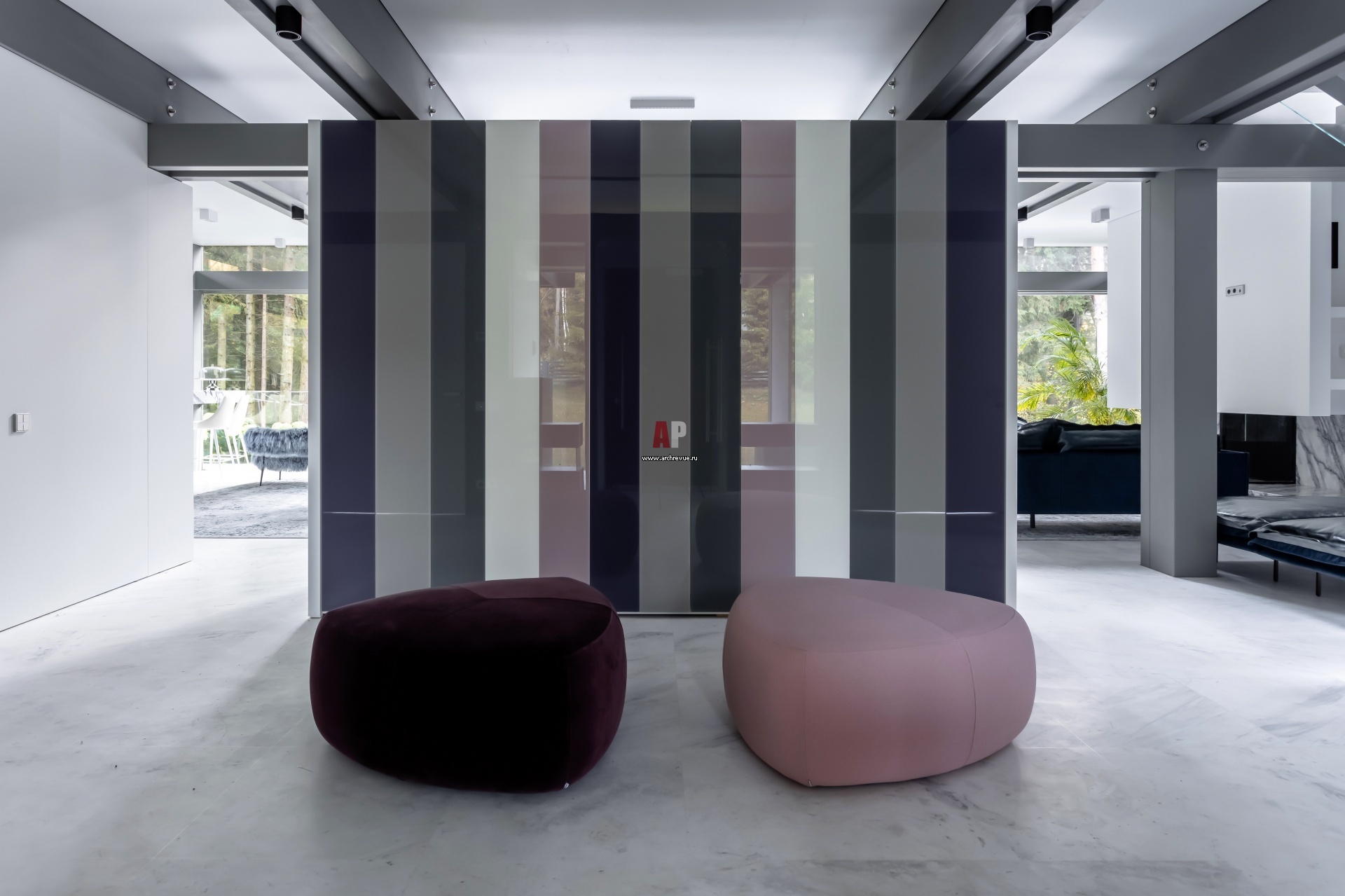 Главный элемент прихожей – шкаф Lago со скрытой системой открывания. Фасад выполнен из стекла и представляет собой комбинацию вертикальных панелей разных пастельных оттенков.